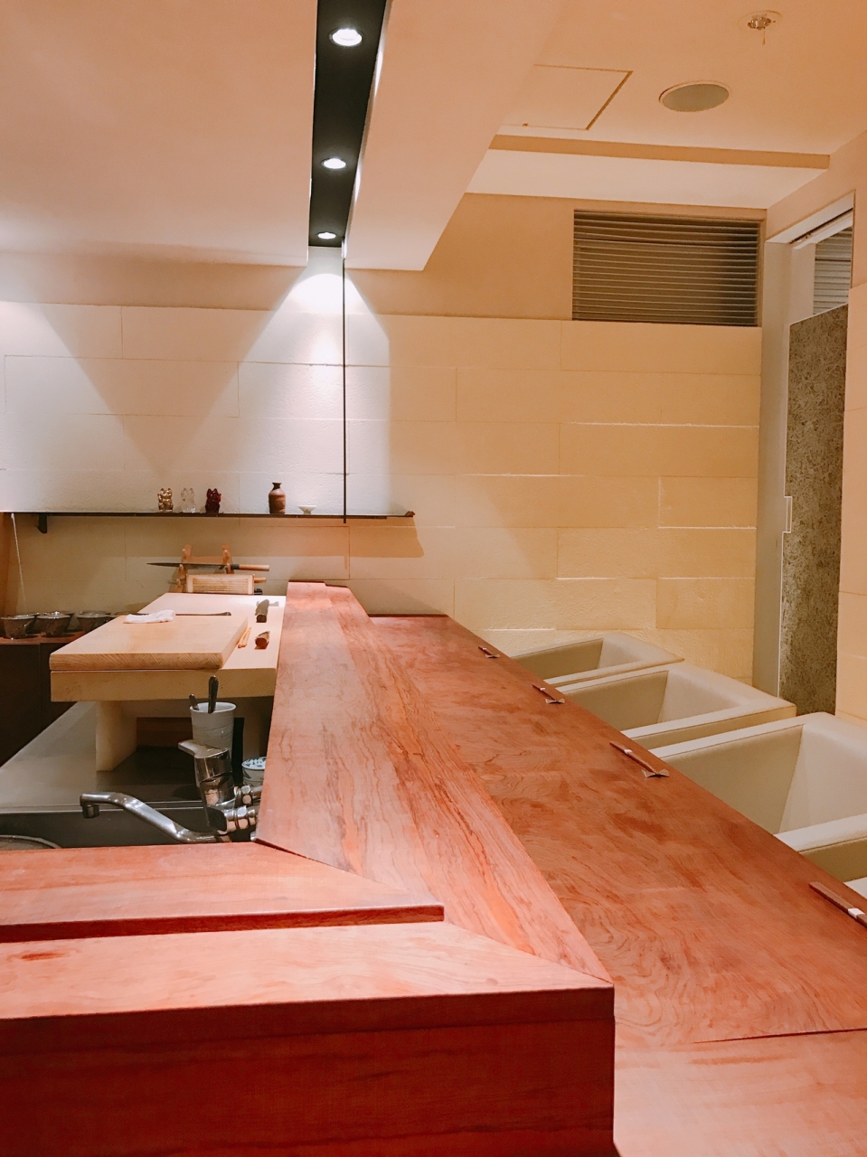 一週間前に6時と予約をしました。到着すると未だ客がおりませんでした。カウンターに案内されて着席。店内は白色が基調です。「月コース」をいただきました。おつまみ7品と握りが8カンと卵と吸い物でした。シャリは酢がさっぱりとしていてやや堅めの歯ごたえで粘りは少ないです。お吸い物は蟹やエビの殻などを煮たものと出汁が良くでていました。おつまみは蟹のむき身の味噌和え、真鱈の白子、焼ねぎと鮪煮物、厚い身のふぐ刺し、鰹の漬け、他1品、ホタテのあぶりしょうゆをつけた磯辺巻きを手渡しでいただいた。鮨はイカ、さより、ヒラメ、甘エビ(三尾)、金目鯛、漬けまぐろ、中トロ、穴子ですした。