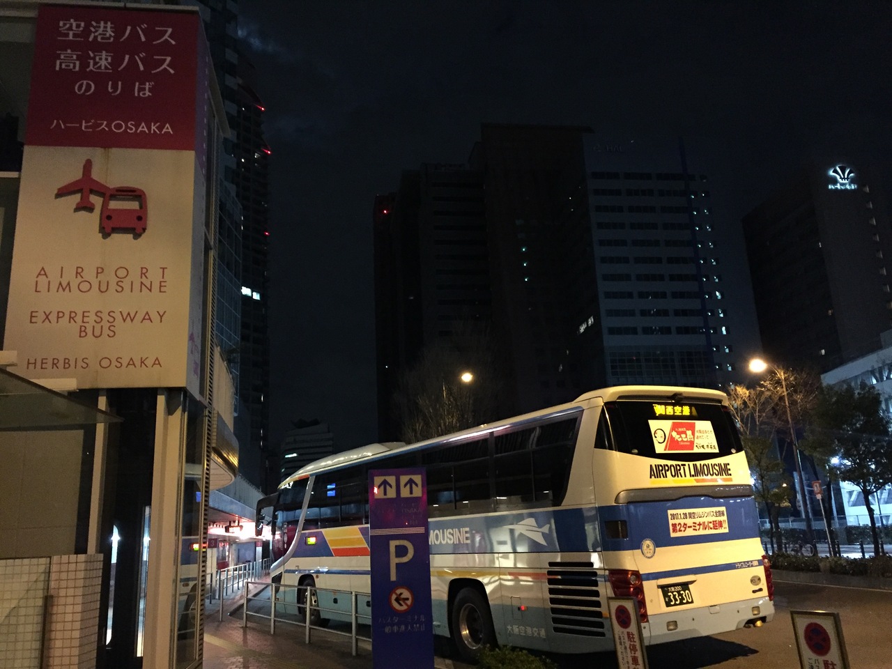 朝4時に関空発→大阪駅(ハービス大阪)行きのリムジンバスを利用しました。 こんな夜中でも、驚いた事に利用者がそれなりにいました! 夜中なので道路の渋滞は殆どなく、1時間ほどでハービス大阪に到着。