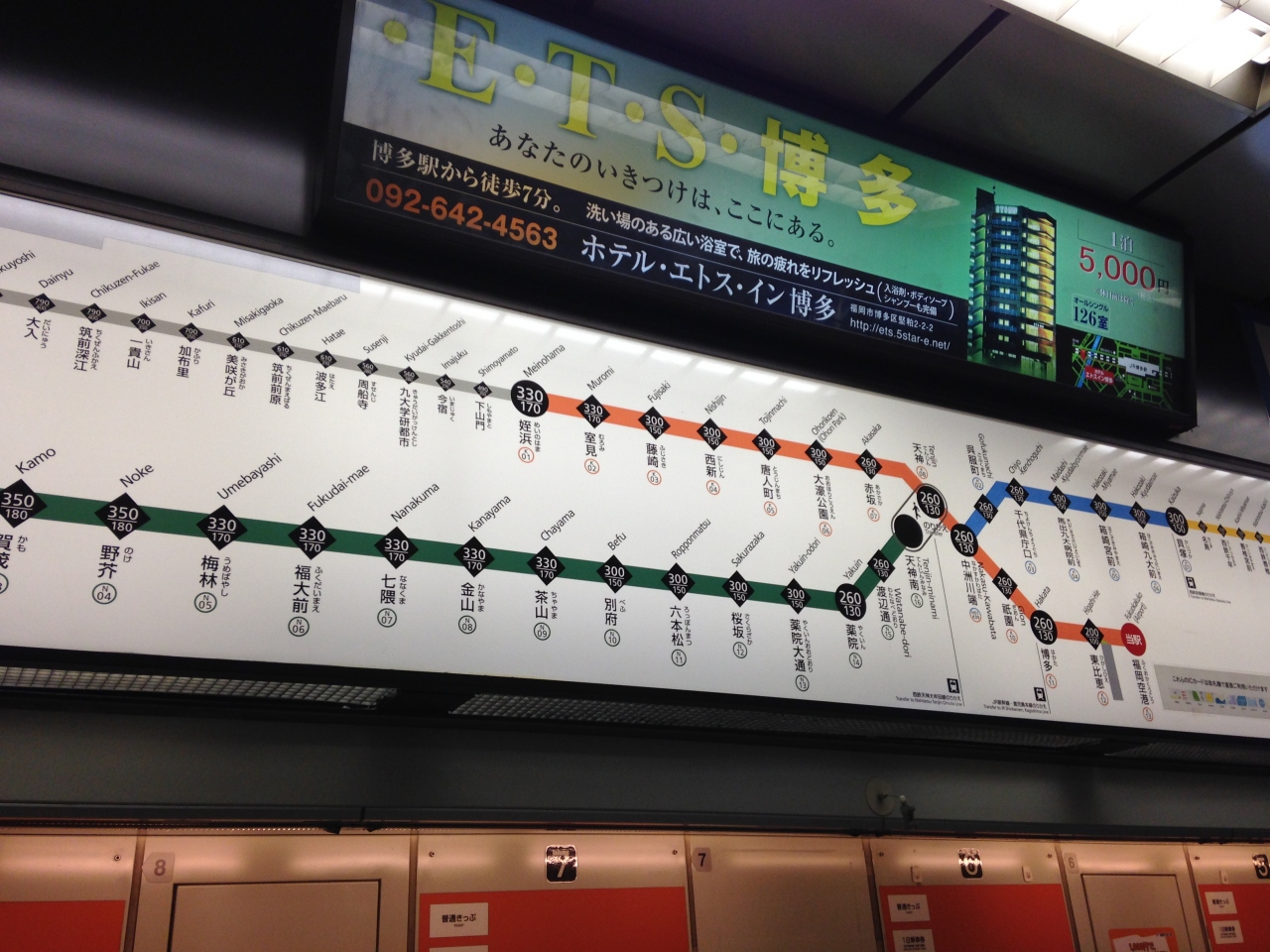 福岡空港につき市内まで行くのにまず乗る地下鉄です。繁華街の天神までは¥260でいけ、10分以内でいけます。スーツケースを持っていてもエレベーターもあるので便利です。表示の仕方も分かりやすく、駅ごとにマークが違うのも面白いです。