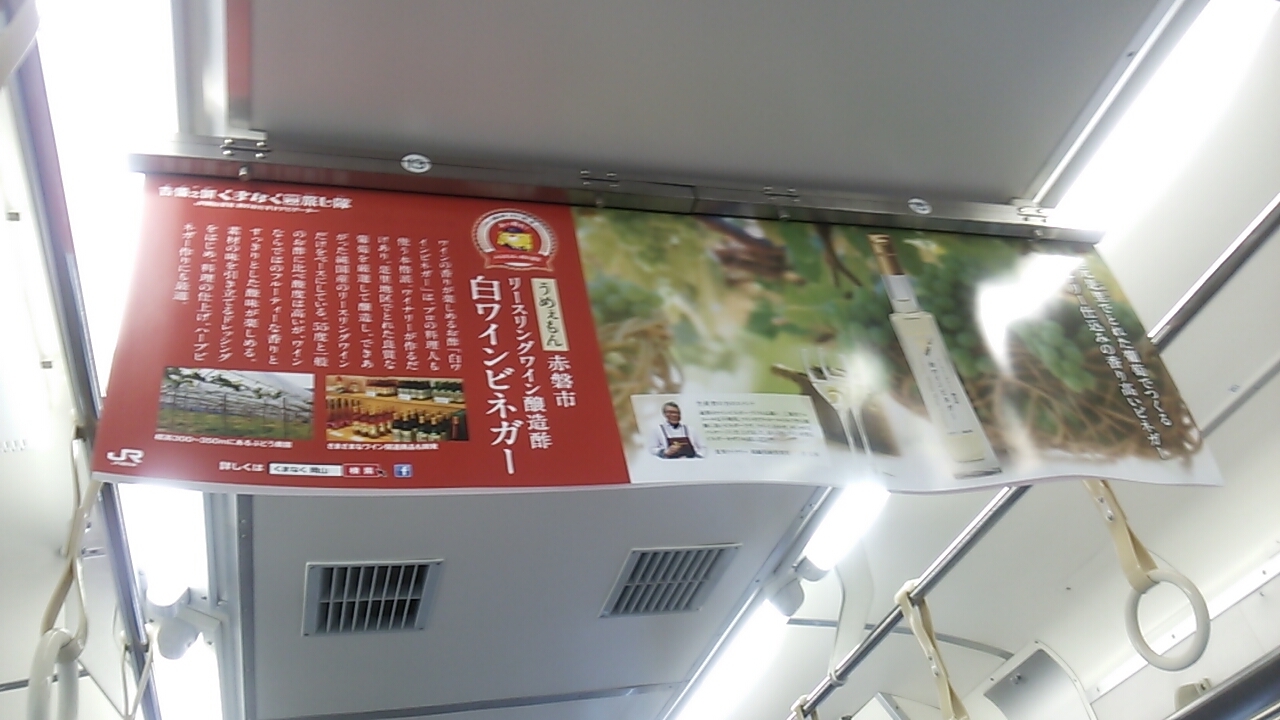 ラッピングの他、中吊りでは岡山の名産品の紹介がされていました。しかし車体はごく普通の近郊電車で、座席は2人掛けの転換式クロスシートとなっています。ただ座席自体は比較的柔らかく快適です。