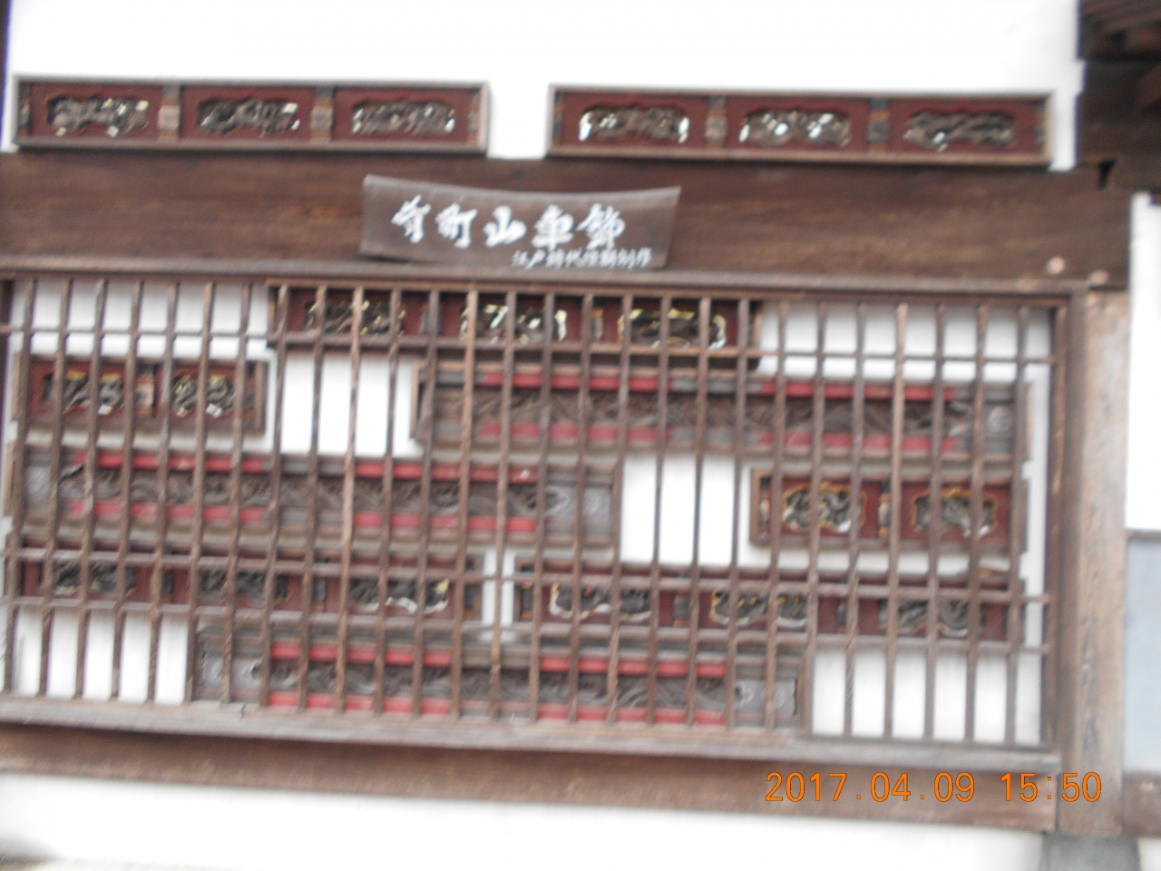 山車飾りをゆっくりと眺められる機会はあまりありませんが 民家の壁に埋め込まれているので 直接触ることはできませんが 格子の中のガラス窓のようになっているので通りがかりには じっくり眺めることができるので とてもいいと思います。