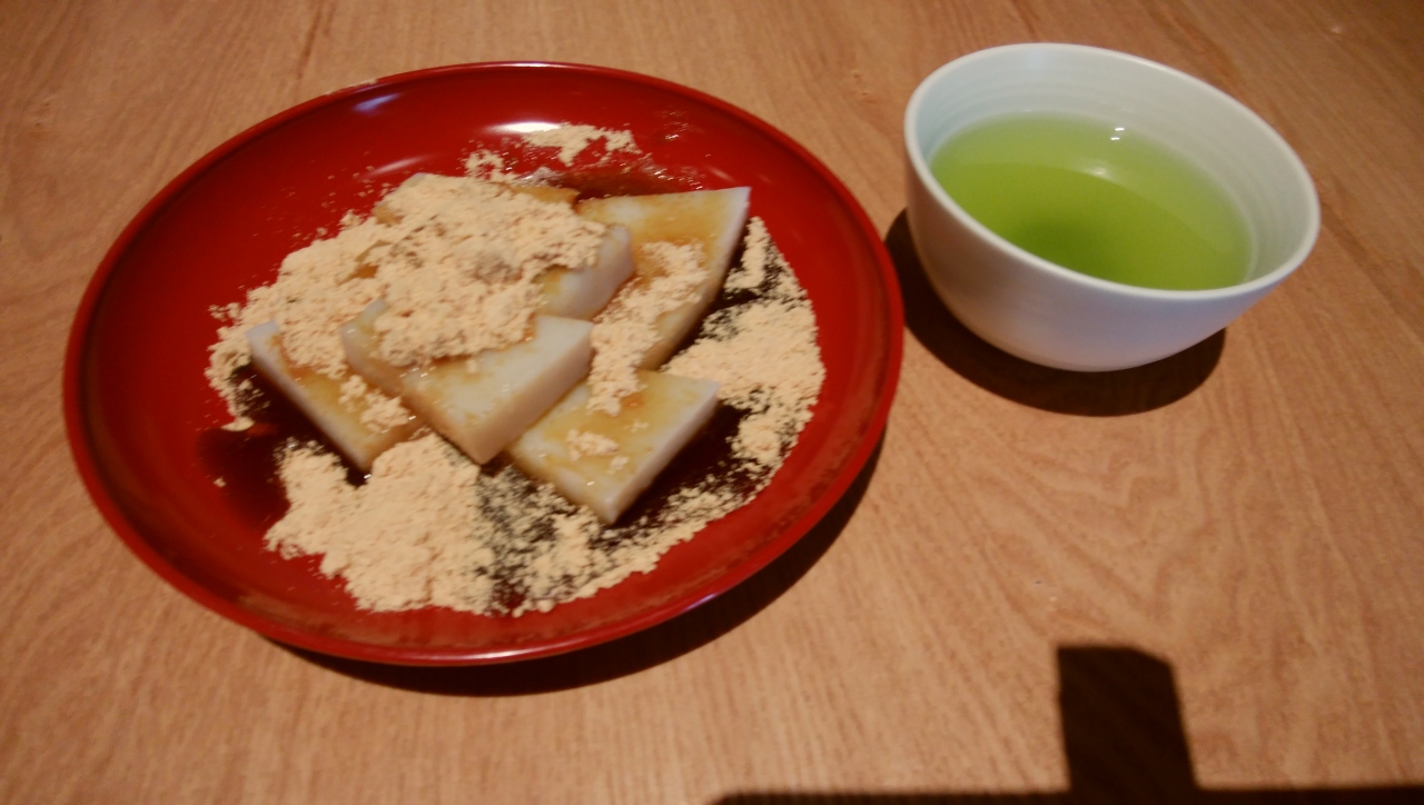 お買い上げとイートインのスペースがあんまり仕切りがありません。先に食券をかって、席について札を渡すというスタイルです。葛餅が一番人気のようです。黄な粉とみつと絡まっておいしかった。お茶は緑茶がサービスでついてきます。お店の前に藤棚があり、風情がありました。ただイートインスペースという感じであんまり長居できる感じではなく、さくっとたべて出るという感じです。