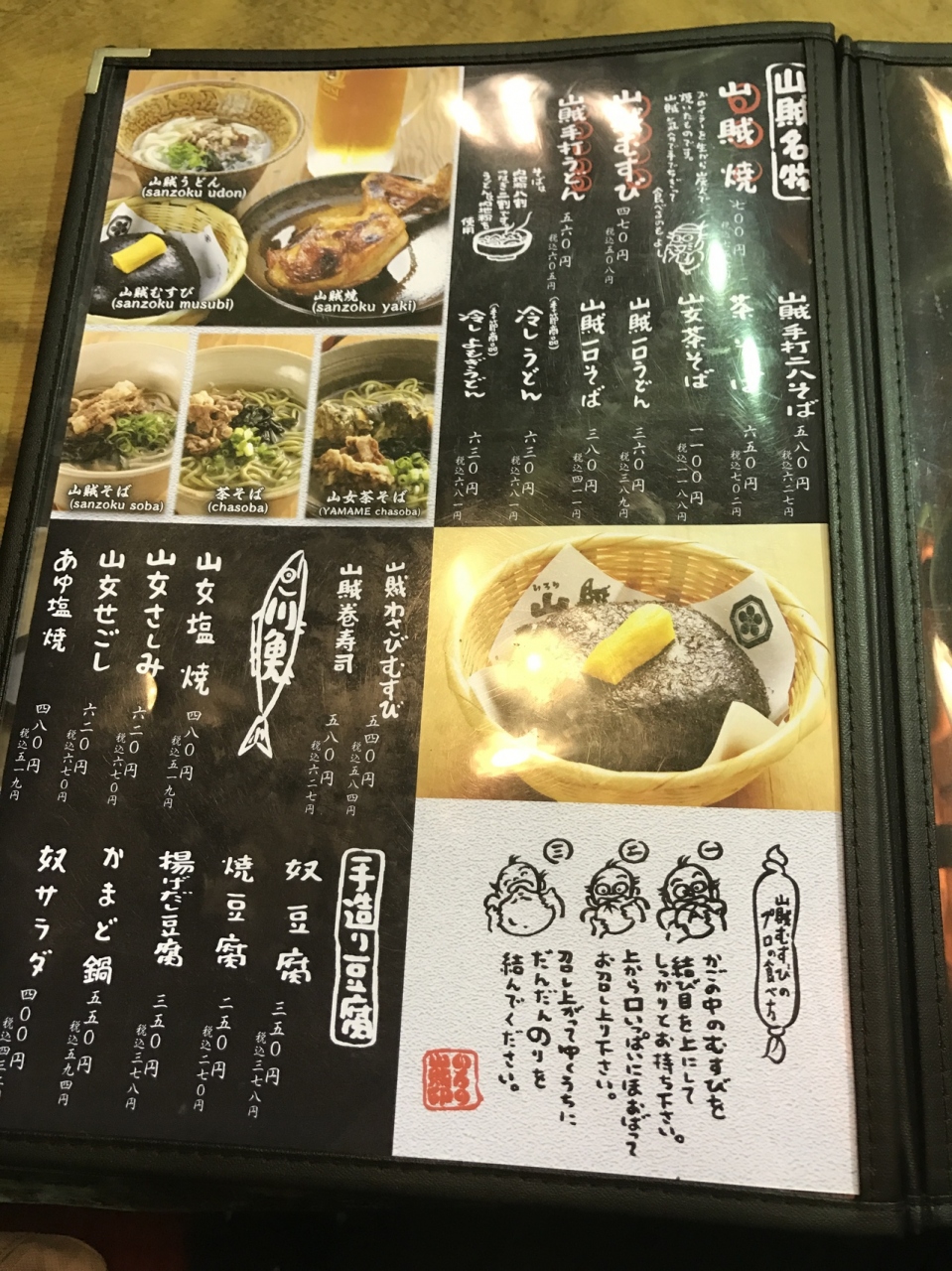 いつも駐車がいっぱいですので、早めに行くのをおすすめします。広い庭の席に座るなら、先にカウンターで注文します。左奥の屋根付きの建物ならテーブルに注文を取りに来てくれます。おすすめは、左奥のお城のような建物。座敷ですが、雰囲気抜群で外国人にも喜ばれます。山賊おにぎりや山賊焼きが有名ですが、川魚が丸々一匹入ったお蕎麦もおすすめです。