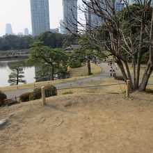 この小山は浜離宮庭園の中でも随一の眺めです。頂上は少し広い広場になっており、そこから、横堀、潮入の池など園内を一望できるほか、東京湾、汐留のビル群、遠くは東京タワーまで見渡せます。大手門入り口からは少し遠いですが、浜離宮の絶景ポイントとしては外せない場所です。