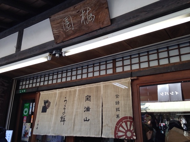 太宰府天満宮の参道にある和菓子屋さんで名物「うその餅」が売っているので観光客が沢山訪れていました。店内ではいろいろな商品の味見をさせてくれます。うその餅は黄緑色の餅の中に木の鳥のうそが1つ入っている縁起物です