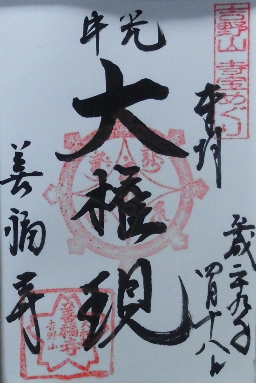 善福寺は山号を井光山とし、高野山真言宗の寺院。櫻本坊の向かい側の道を少し下った所にある。小さな山門を入ると、左側に赤い屋根の本堂がある。此方も、かなり小さな堂宇。中に上がることができる。ご本尊の薬師如来を中央に、不動明王、蔵王権現、役行者、弘法大師が祀られている。小生の眼を引き付けたのは「井光蔵王大権現」。金峰山寺蔵王堂にいらっしゃる権現さまに較べるまでもないフィギュアのように小さな像ではあるが、忿怒の形相の中にも美しさと気品を感じさせてくれる。