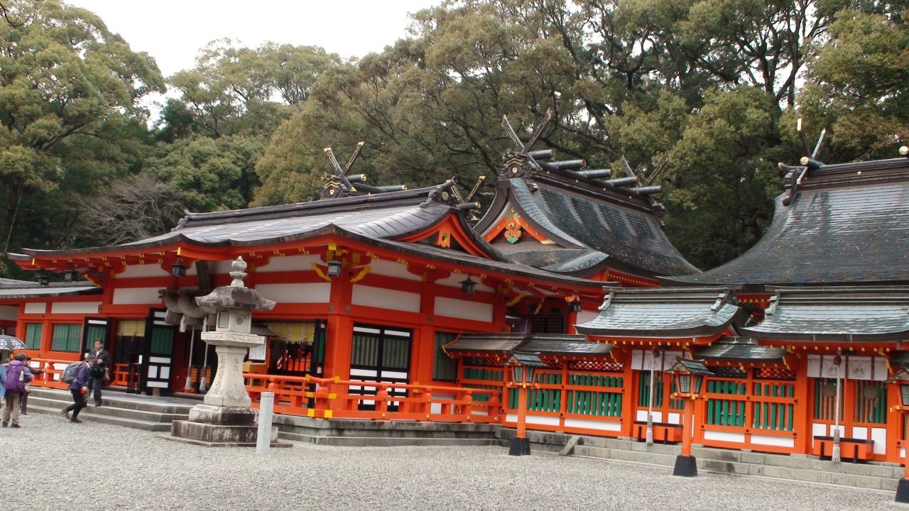 国道42号線を北上すると新宮の市街地を見守るように速玉大社の案内看板が目につく。ここには広い駐車場も完備され、ゆっくりとお参りすることができる。参道には樹齢1000年を越える「なぎ」のご神木が迎えてくれる。朱の色がまぶしく三山の一つとして神々を御祀利してあり、玉砂利を踏みしめ聖地へお参りする。
