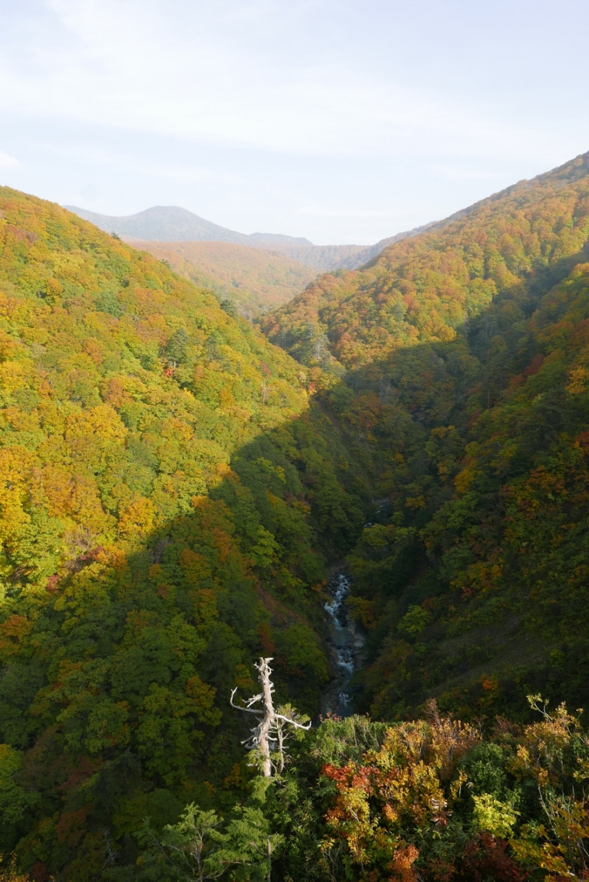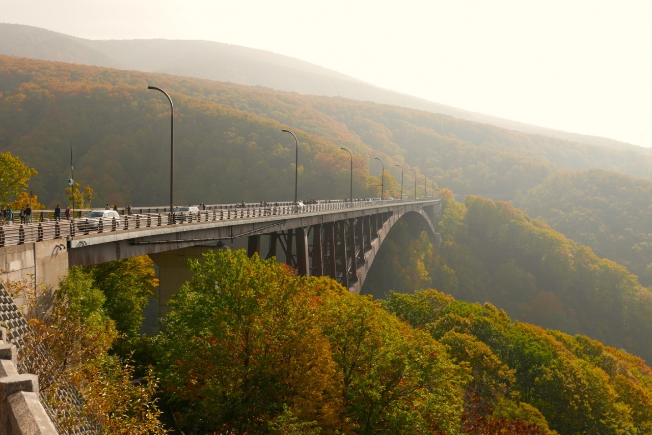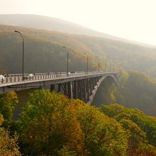 八甲田山の紅葉の季節に行きました。橋はスケールが大きく山々が見渡せて紅葉も大変きれいでした。橋の脇に地位車上がありそこから橋を渡って行きます。橋の真ん中のほうへ歩いて行くと谷が奥まで見えてきて美しい風景が広がって行きます。駐車場が少なくて道路がかなり混雑していました。