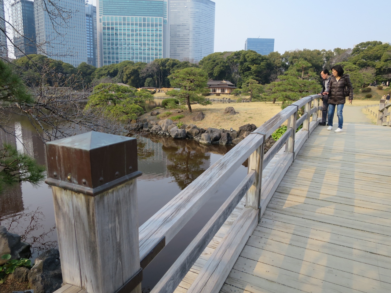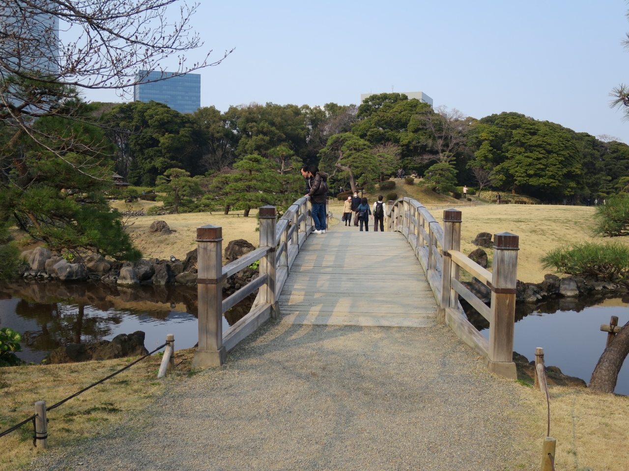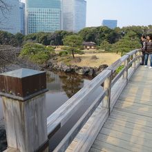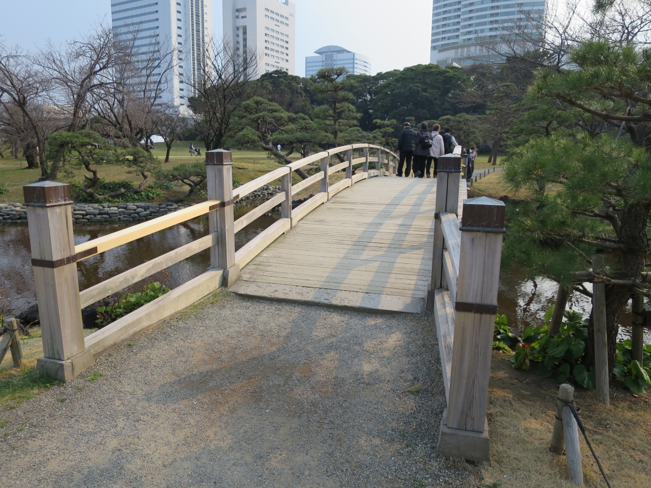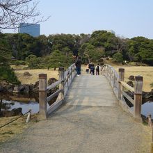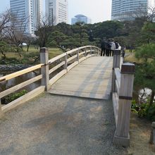 浜離宮恩賜庭園の御亭山から富士見山に向かう間にある低い太鼓橋です。ちょうど潮入の池と横堀を繫ぐ水路の上に掛けられています。この橋の上から望む潮入りの池の景色は、正面に中島の御茶屋が池にぽっかりと浮かぶように見え眺め良い場所の一つです。それゆえ立ち止まる人が多いです。