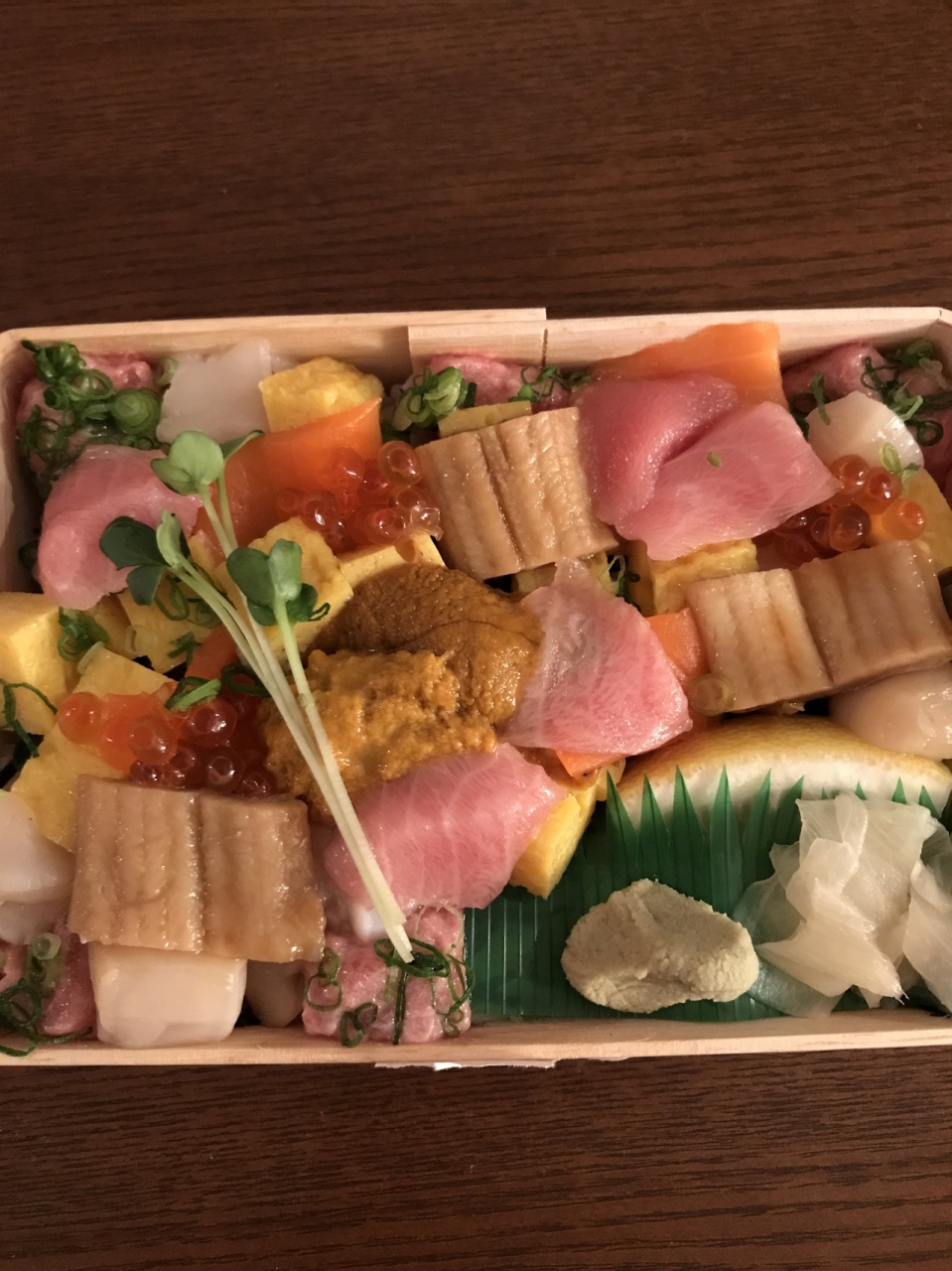 スシアベニューK.Sは伊勢丹新宿店の地下にあるロール寿司やちらし寿司専門のお寿司やさんです。ちょうど閉店間際に行きましたのです。特選海鮮ちらしが何と500引きで買えました。トロに穴子にホタテと海鮮がぎっしりで豪華でした。