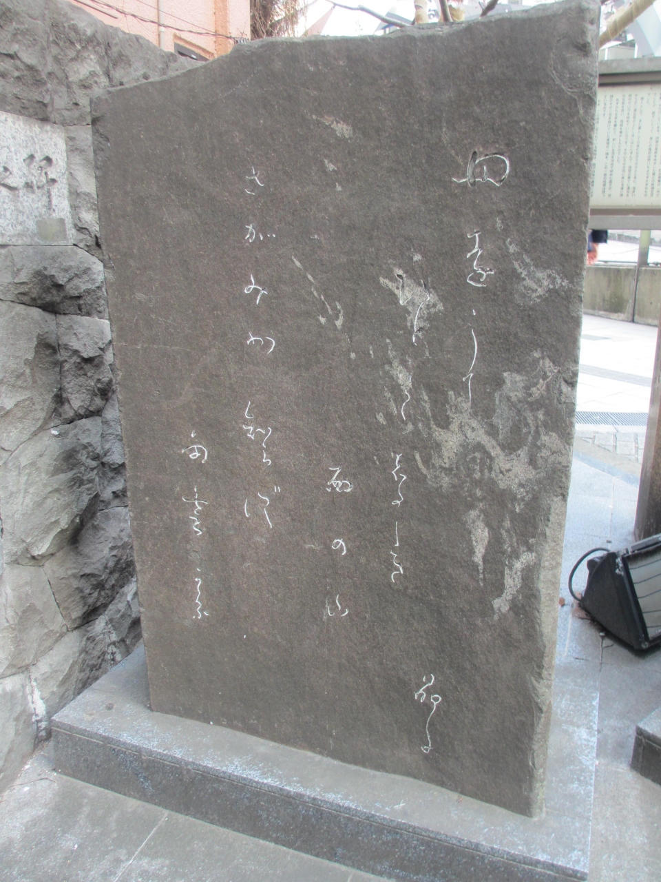 道玄坂上交番前交差点で渋谷マークシティ側の角にあります。碑を見たときには何が書かれているのかわからなかったのですが、隣に解説文があったのでよくわかり良かったです。私が何が書いてあるかわからないと思った筆跡は与謝野晶子自身の筆跡で書簡からの集字だそうです。