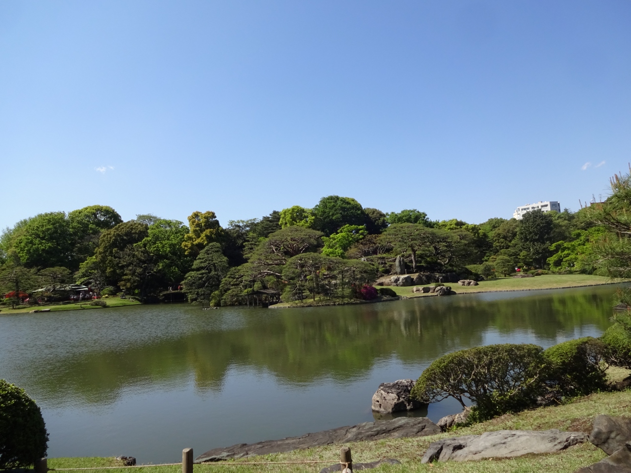 小さな島や池、庭園の木々などが池の水と調和して美しい光景です。