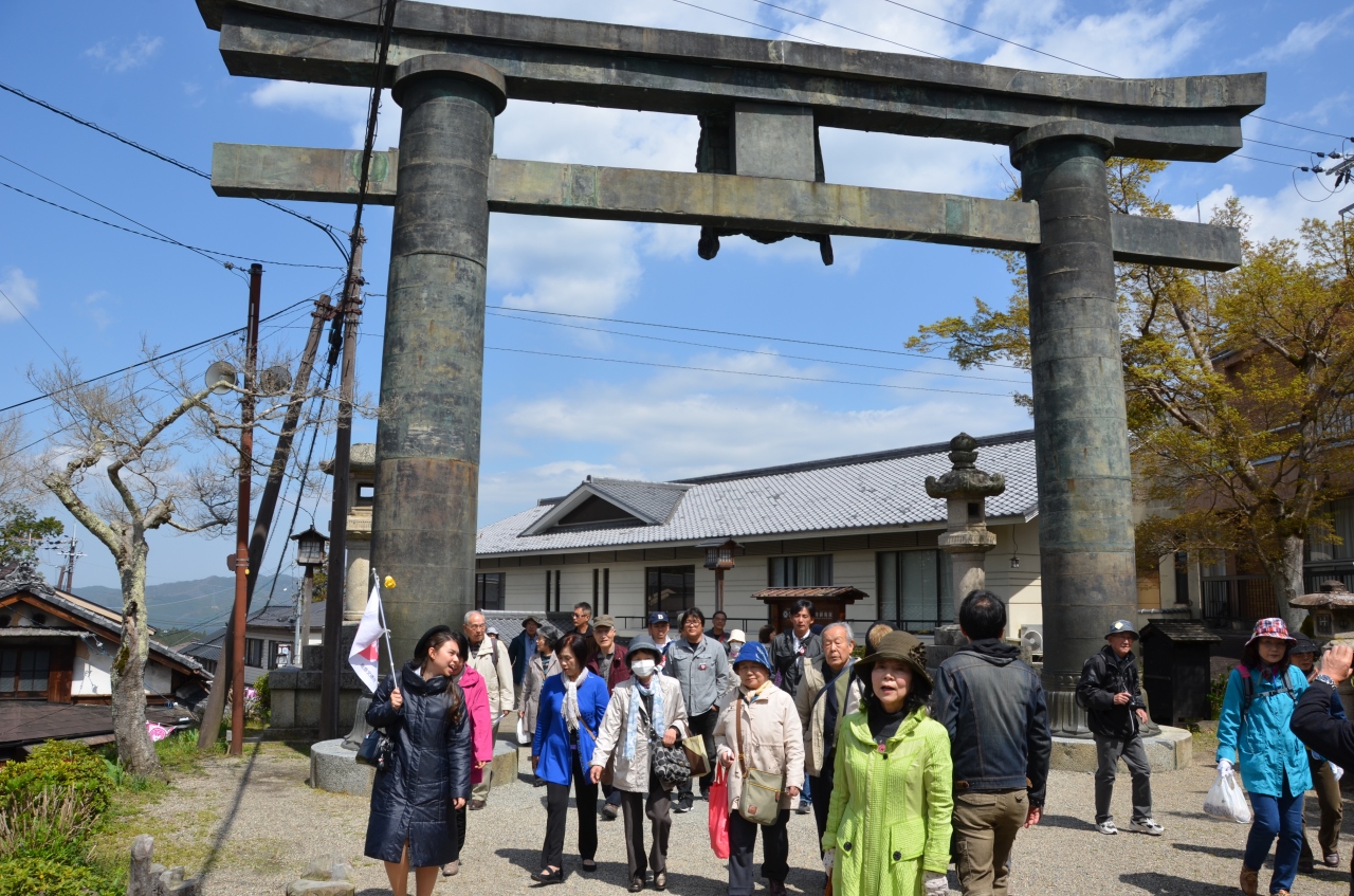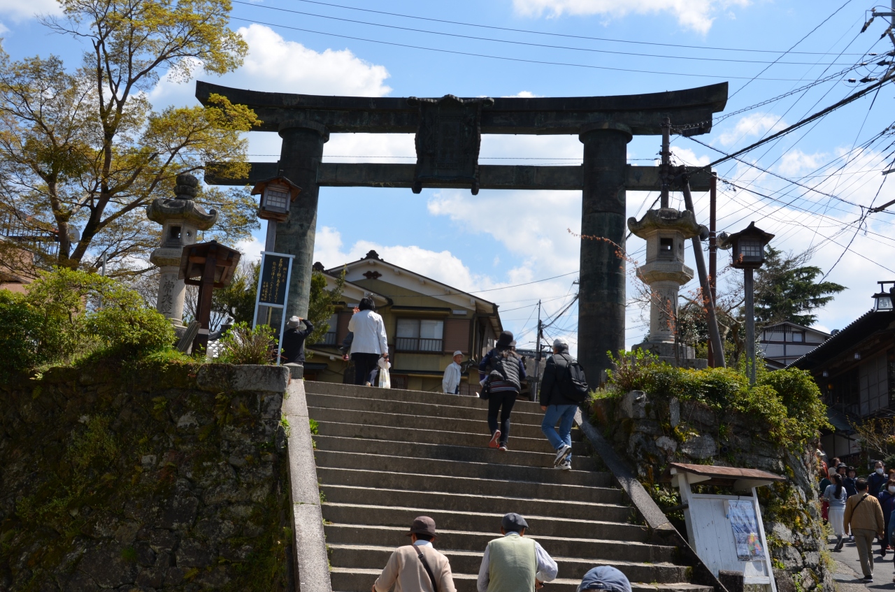 駐車場に車を止め、黒門を潜り暫く歩くと小高い台地の上に銅で造った鳥居が堂々と聳えている。ここが修験者たちの最初の修行門でここを潜って体を清め奥へと修行に向かったといわれている。見学者も少し迂回してこの鳥居をくぐって桜見学へと出かける。