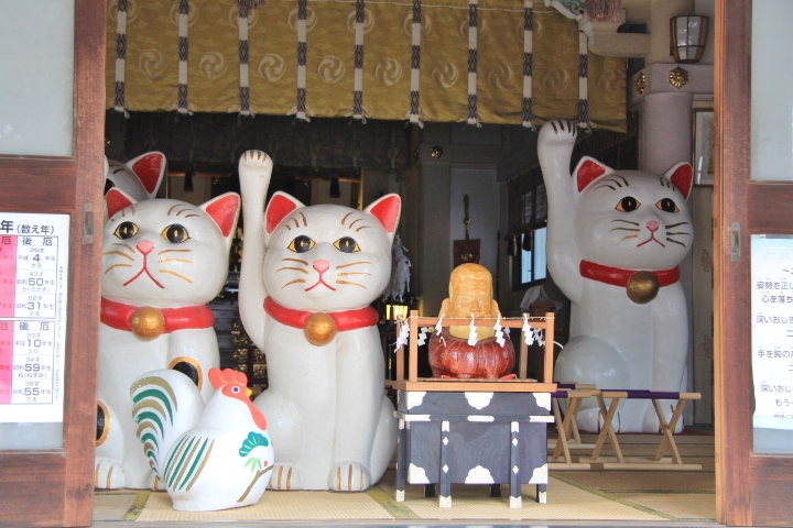 また、招き猫発祥地を謳っていて社殿の中には大きな招き猫がいくつも置かれています。こちらも見どころのひとつになっています。