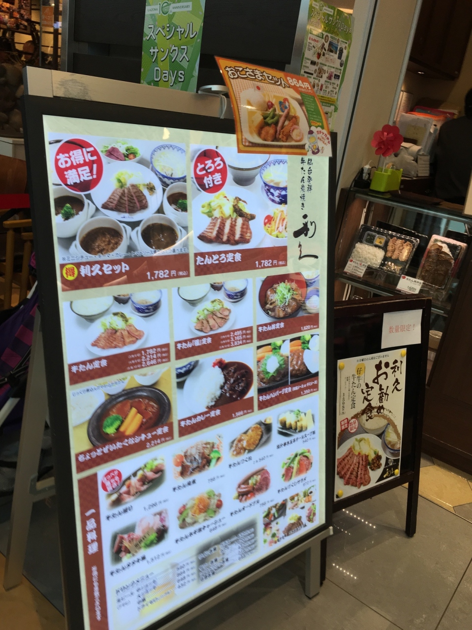 川崎ラゾーナの中に入っている牛タン屋さんです。週末のランチ時に利用したためかなり混んでいて40分ぐらい待ちました。どれも美味しそうで何にしようかかなり迷いましたが、お得な利休セットにしました。牛タンが4切れとテールスープ、ライス、サラダ、ミニシチューがついてきてついてきました。このミニシチューはカレーやトマトソース煮にも変更することができました。ちょっと高めですがかなりボリュームもありしっかり食べれるのでオススメです。