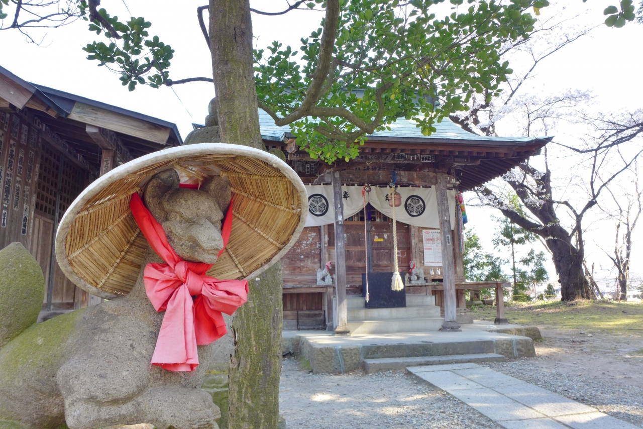 石段の脇に置かれている狐の石像が編み傘を被っているのが面白かったです。