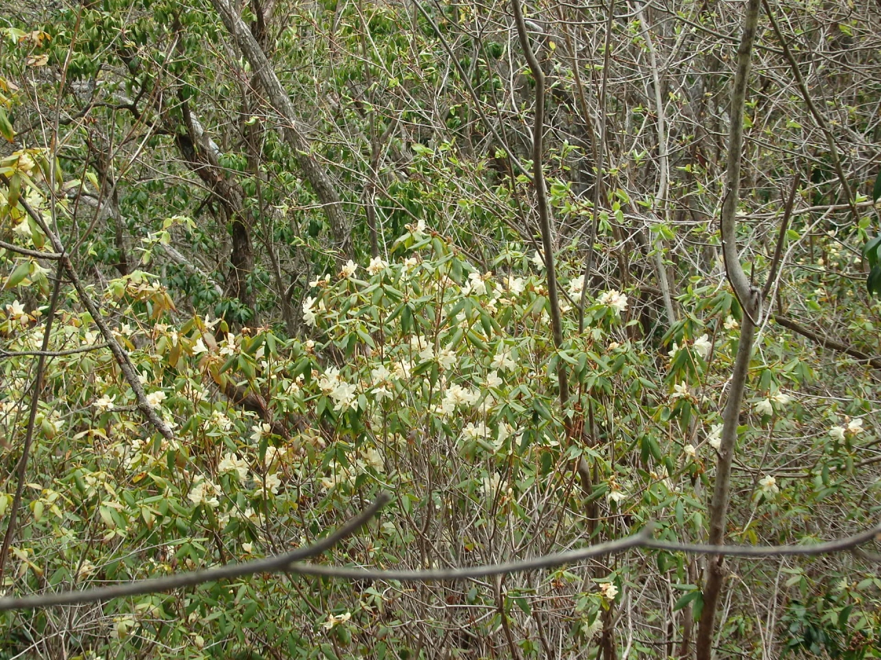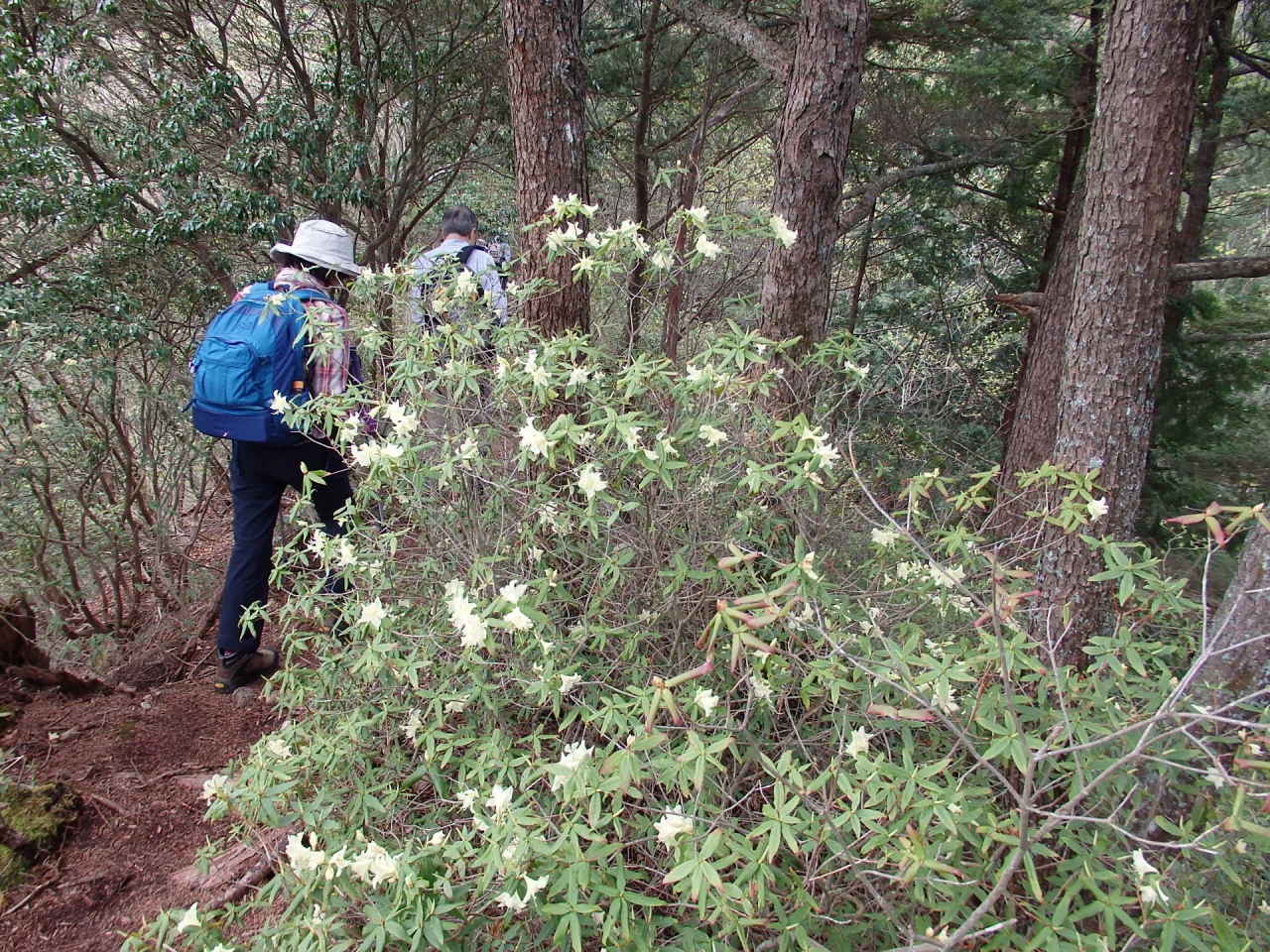 淡い黄色のヒカゲツツジは登り始めて50分ほどで見えだし、そのあと所どころに咲いています。さらに10分ほど行くと先ほどより多くさいている。山頂過ぎても少し咲いていました。他のツツジほど華やかさはありませんが落ち着いた感じのする花で、私の好きな花の1つです。色が淡い黄のため写真映えしません。ヒカゲツツジは4月7日に降った雪のダメージを受け、蕾が枯れて今年は冴えないということらしいです。それでも少しは見られたのでよかったです