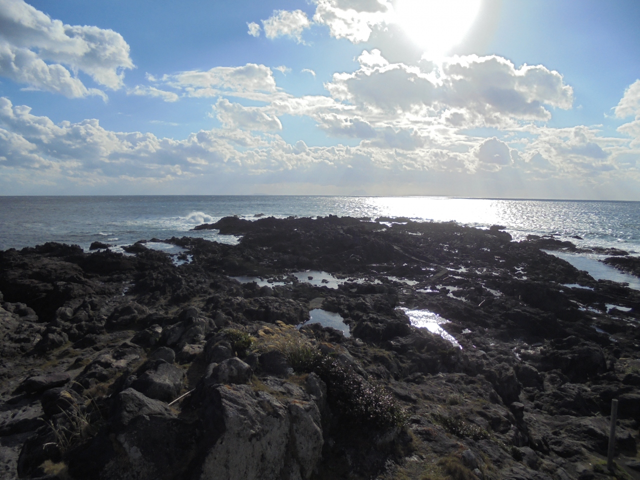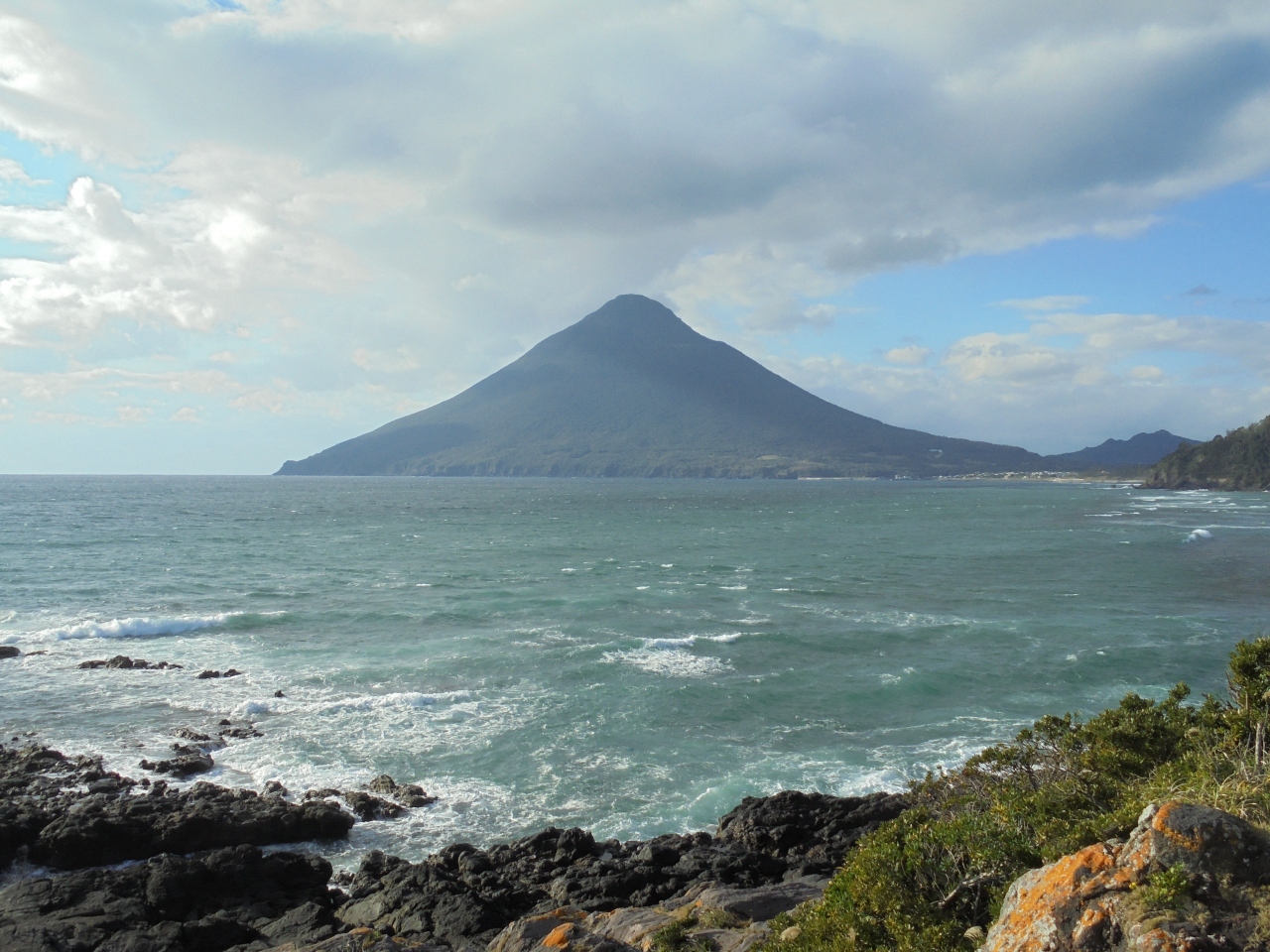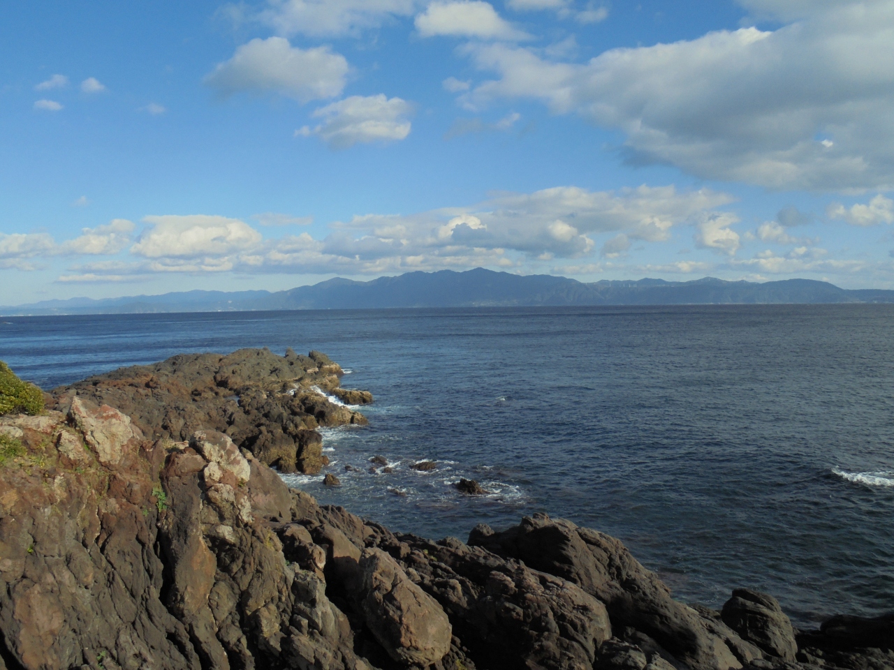 そして岬の先端まで行くと正面に遠く島影が。後ほど調べたところ硫黄島、いわゆる鬼界が島とのこと。天気が良ければ見えるそうです。