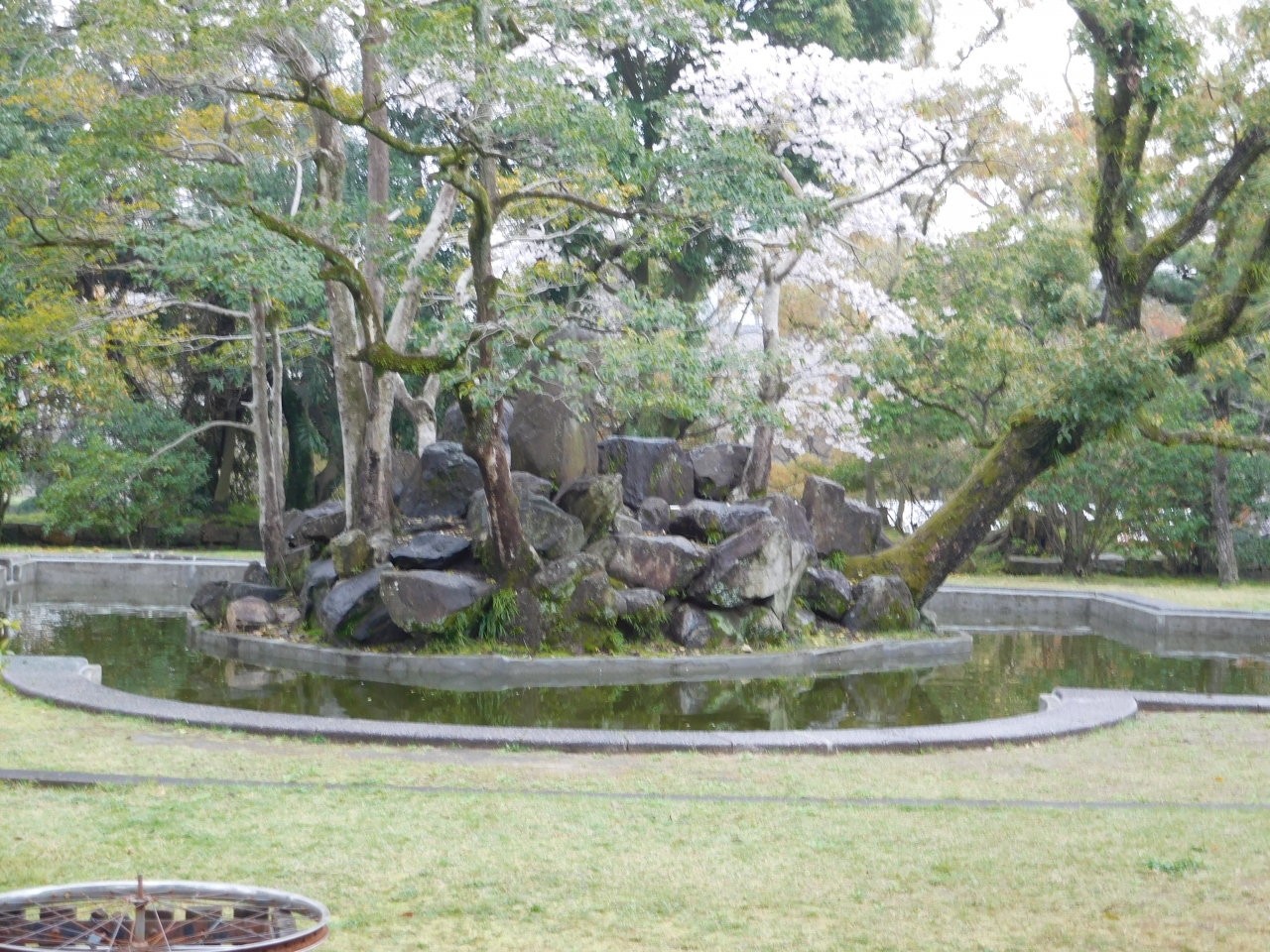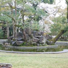 RCC(中国放送)側の裏御門跡から入り、階段(石段)を上がった先の左側にあります。ちょっと開けたような場所になっていて、変わった形の池の中央には、ごつごつした石が積まれ、数本の木が植わっていて、まるでオブジェか作品のようになっていました。