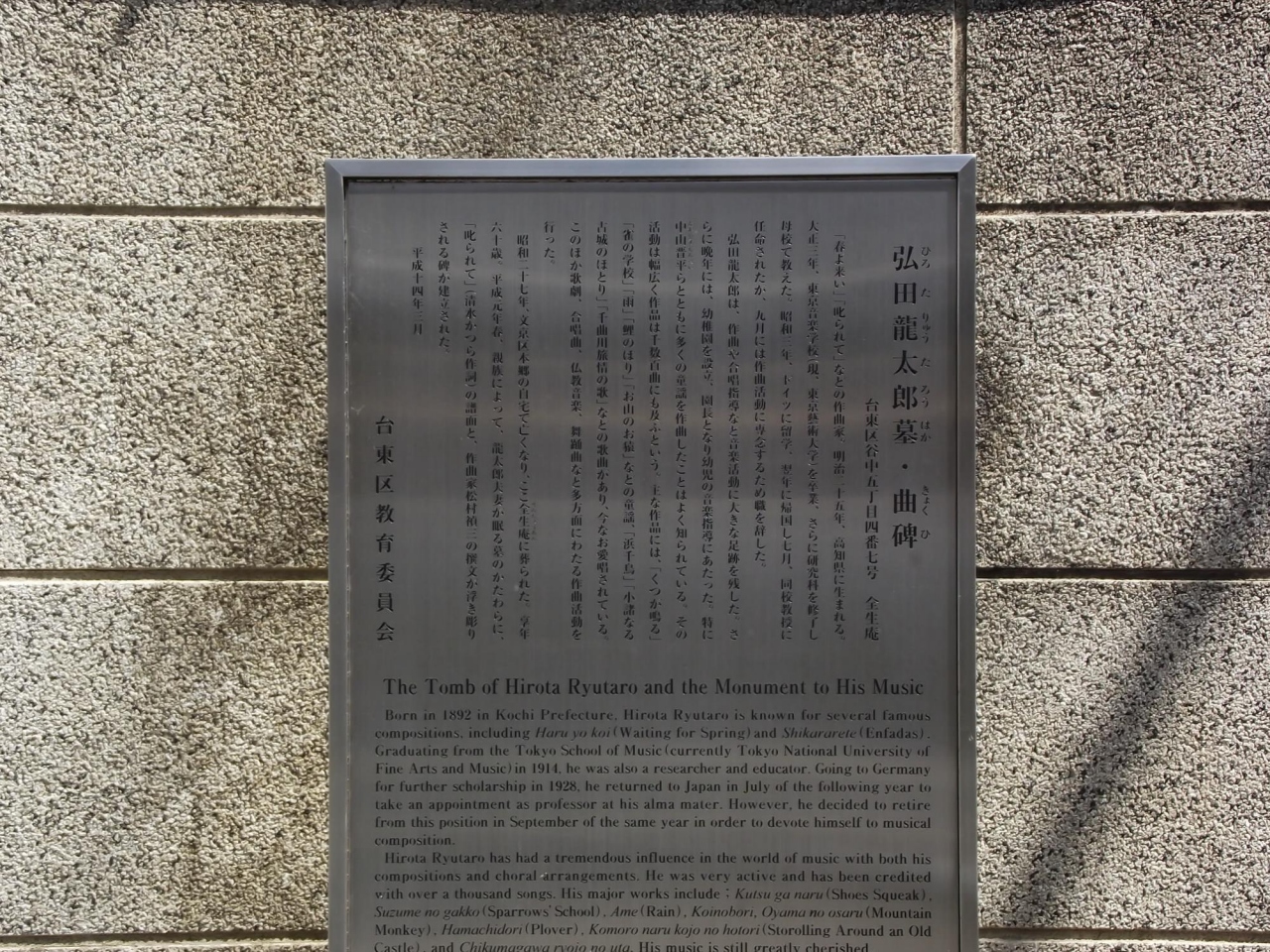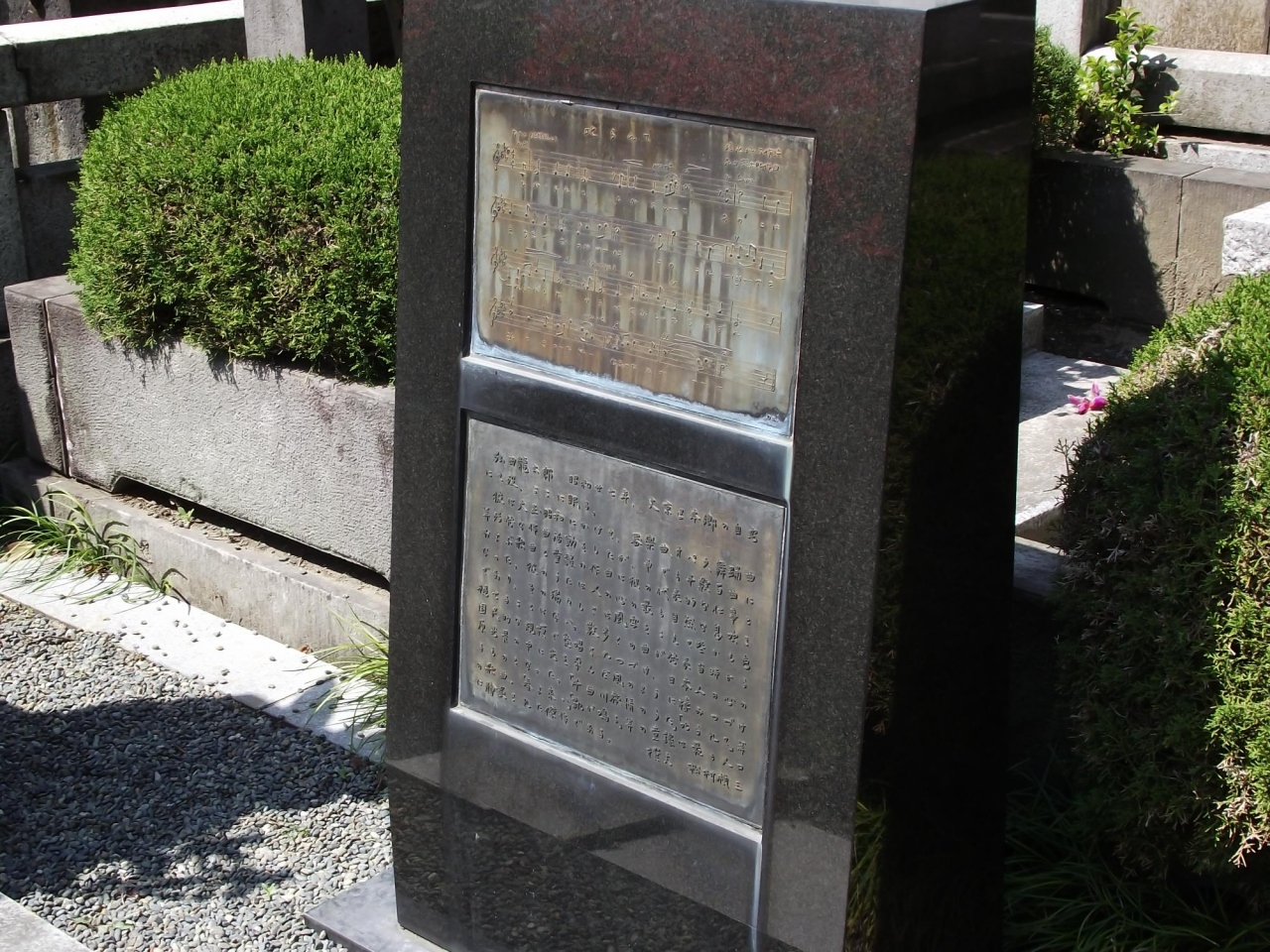 - 墓石とともに 「叱られて」 の譜面と撰文が浮き彫りされた碑が建ててあります