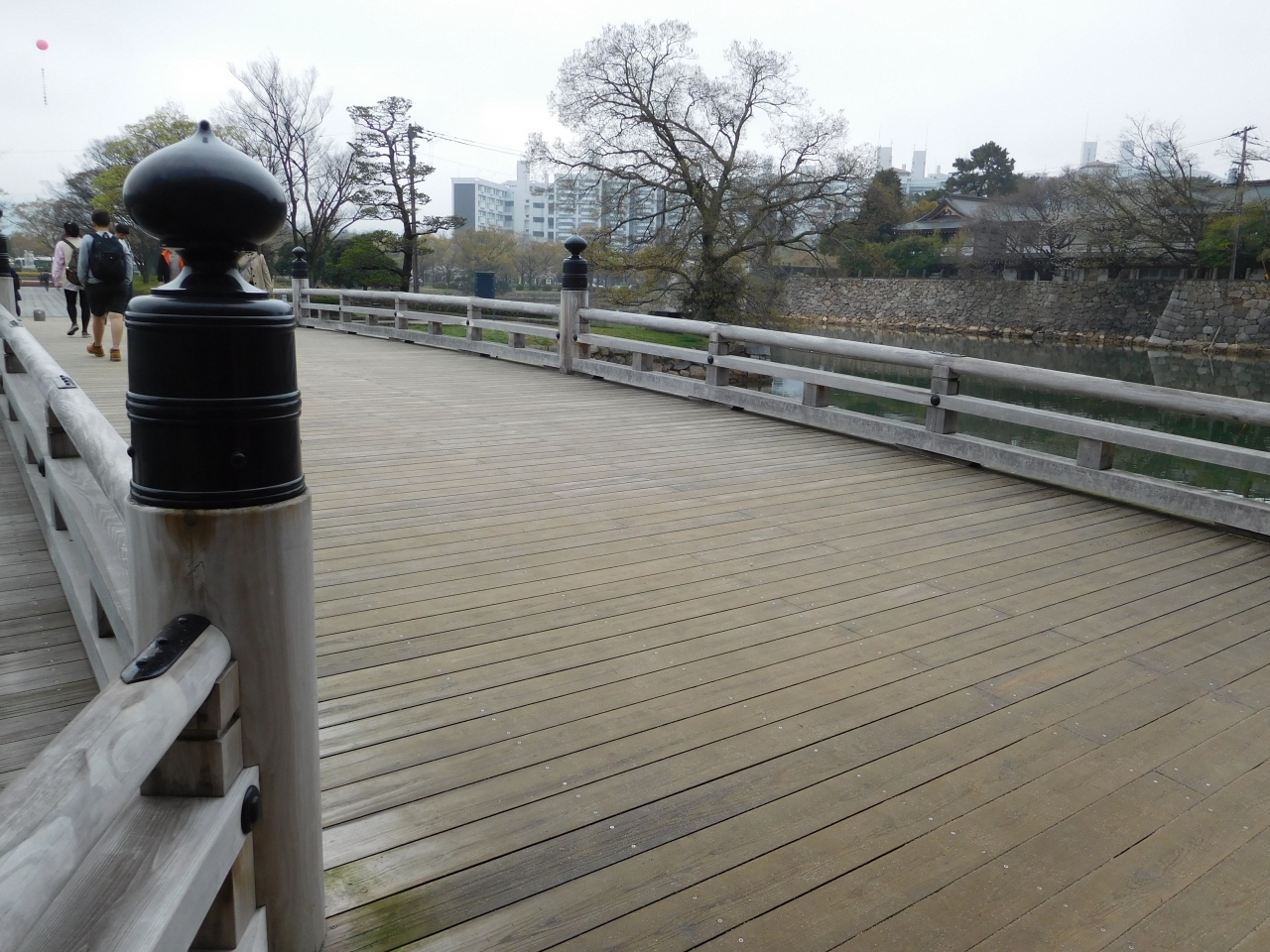 広島城の表御門(二の丸)へと通じる、内堀に架けられた、歩行者専用の橋です。復元された橋なので、とても綺麗に整備されていました。この橋を渡ると、二の丸にある3つの櫓(平櫓・多門櫓・太鼓櫓)を見学する事が出来ます。