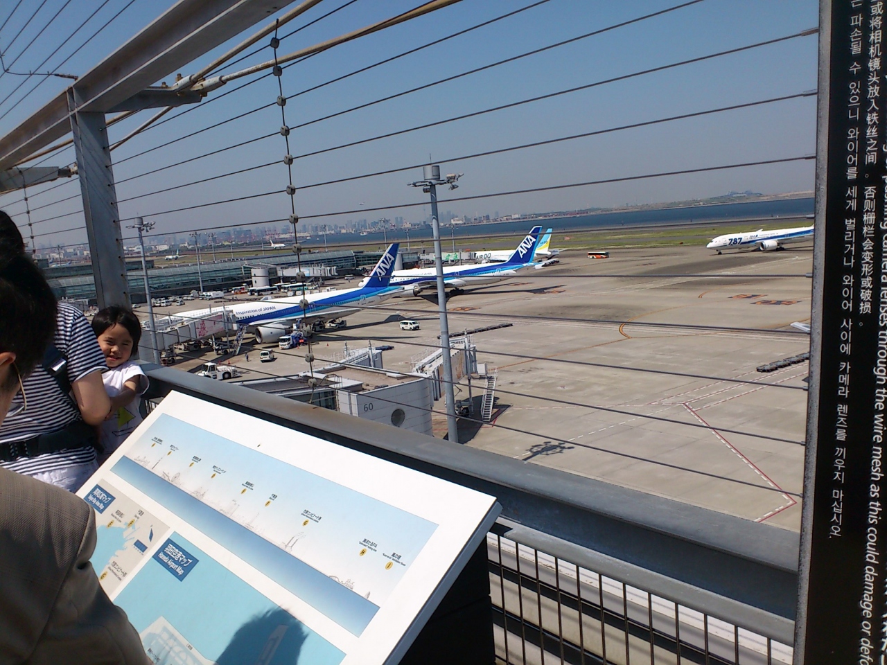 ANA便で沖縄へ行くために羽田の第2ターミナルへ行きました。かなり早く着いたので、展望デッキに行くことにしました。エレベーターで一気に5階まで上がると、広い展望デッキがあり、多くの人々が飛行機を眺めたり、息でいました。目の前はほとんど青いANAの飛行機しかありません。