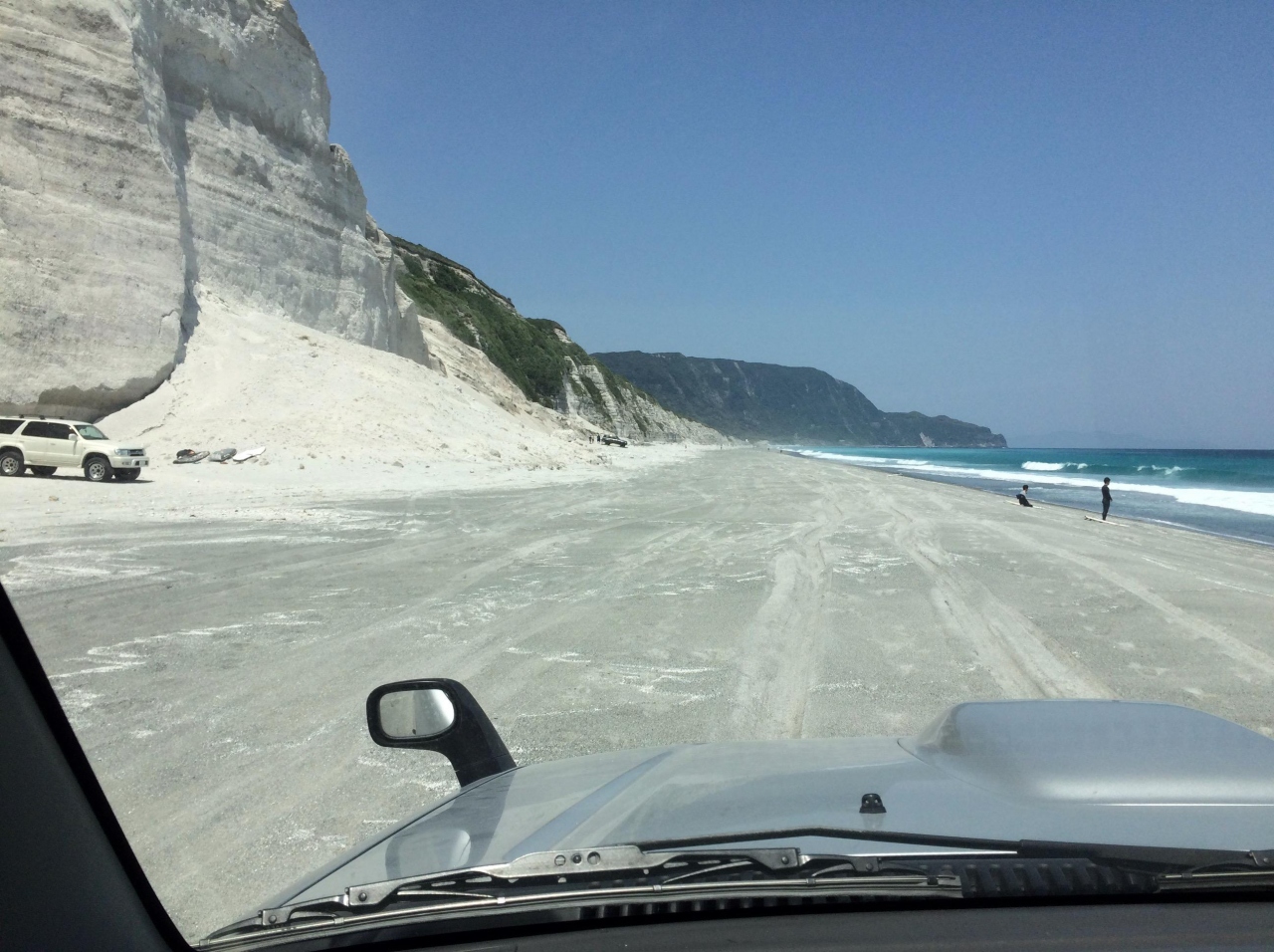 島のサーファーが朝走り轍になぞれば四駆なら走り絶景を見られるかな
