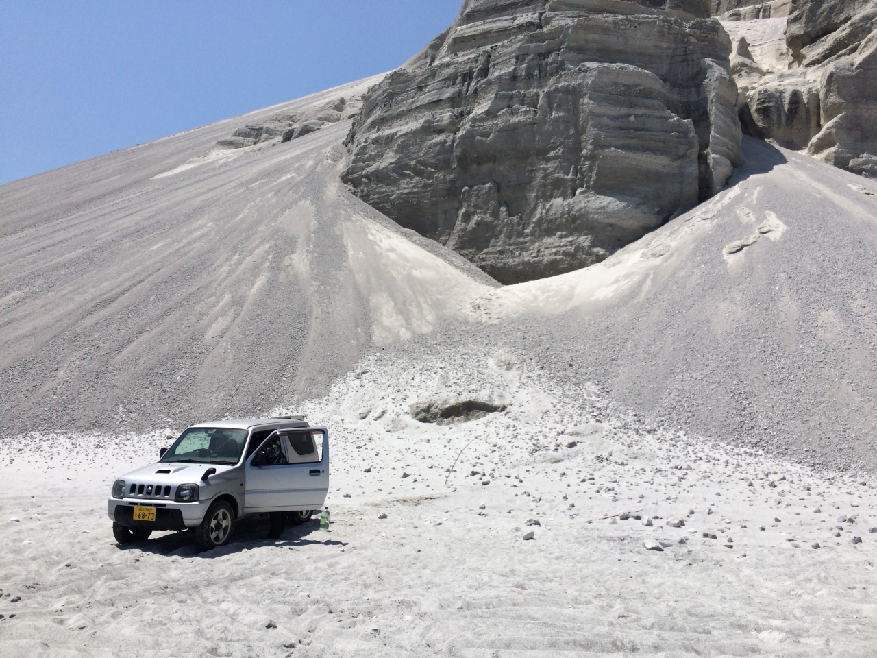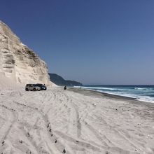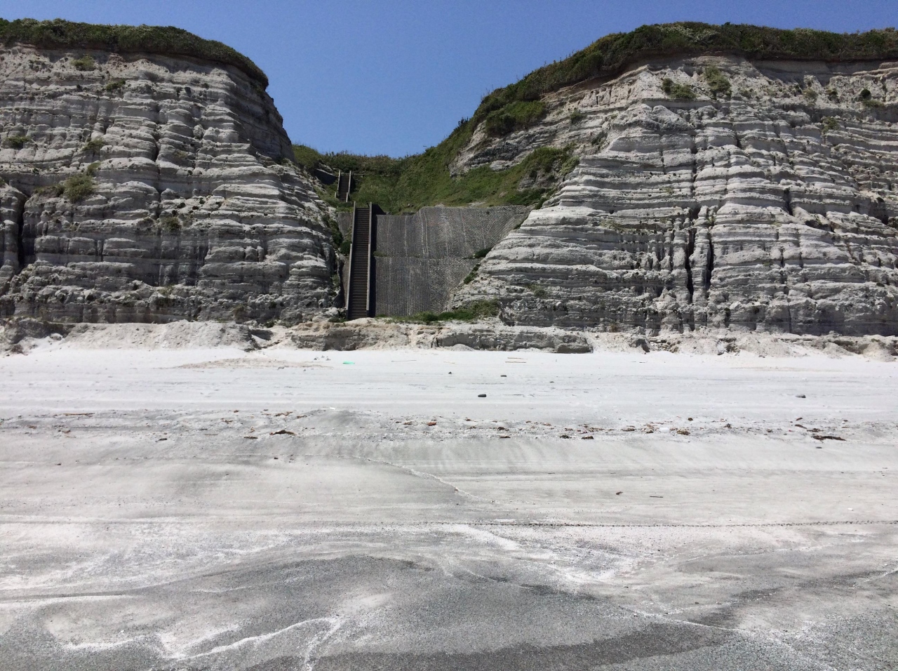 新島東海岸、羽伏浦という数キロ続く抜群のビーチの南から島の南端まで続く、数キロ続く真っ白な断崖、その下は幅50メートルぐらいが断崖から崩れたらだろう砂地が海に続く