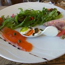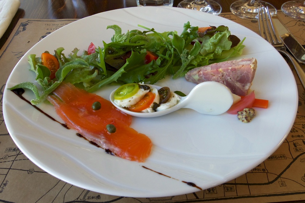 自分としては奮発してコースランチを予約しました。前菜(地元産の野菜、甲斐サーモン、自家製リエット、チーズ)、ポタージュスープ、そしてメインディッシュは甲州ビーフのステーキ。デザート盛り合わせとコーヒー。たっぷりの野菜もお肉も果物も、すべて上質な山梨産。もちろん美味しい。地産地消を徹底しているのがすばらしいです。