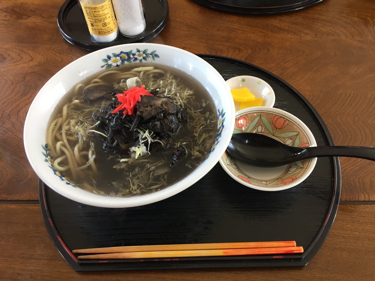 潮のほのかな香りはしたが、味が薄い、スミのコクがなく常備してある塩をふんだんに入れた。ようやく食べれる程度になったが麺はパサついていた。友達はすむばりそばを食べたが、やはり薄いとの事。もう一人はタコ丼をたべたがそれは普通だったとの事。