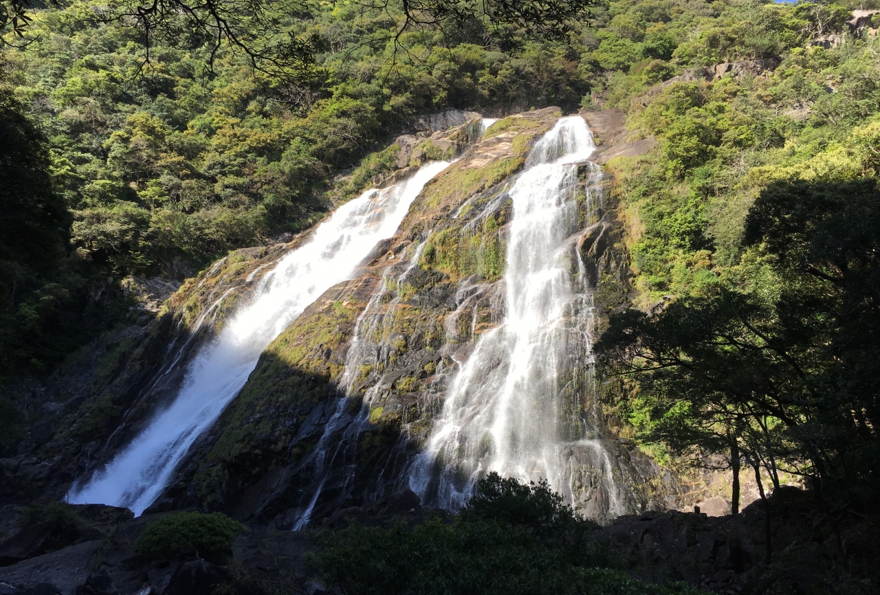 屋久島は海の中にいきなり高い山が出現したような所だから多くの滝がある。屋久島を反時計回りにドライブして西部林道を走り終えたとこらに滝がある。落差大きいです。水量も昨夜の豪雨で豊富です。残念なことは滝の近くまで行けないこと、駐車場が少ないこと、が難点かな?