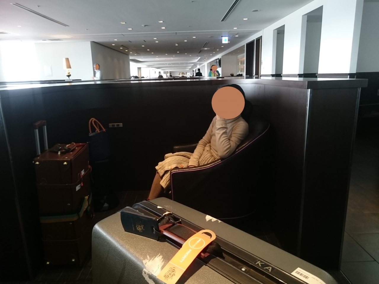 仕切りがないスペースと囲いがしてあるスペースに分かれているのでお好みで時間を過ごせます。1台か2台無料のマッサージチェアが設置してあるので長旅で疲れた身体をほぐしてくれます。通常飛行時はおつまみとドリンクのみですが、欠航が相次ぐとおにぎりなどの軽食メニューが出てくる配慮がうれしいです。喫煙ルーム完備なのもありがたいです。