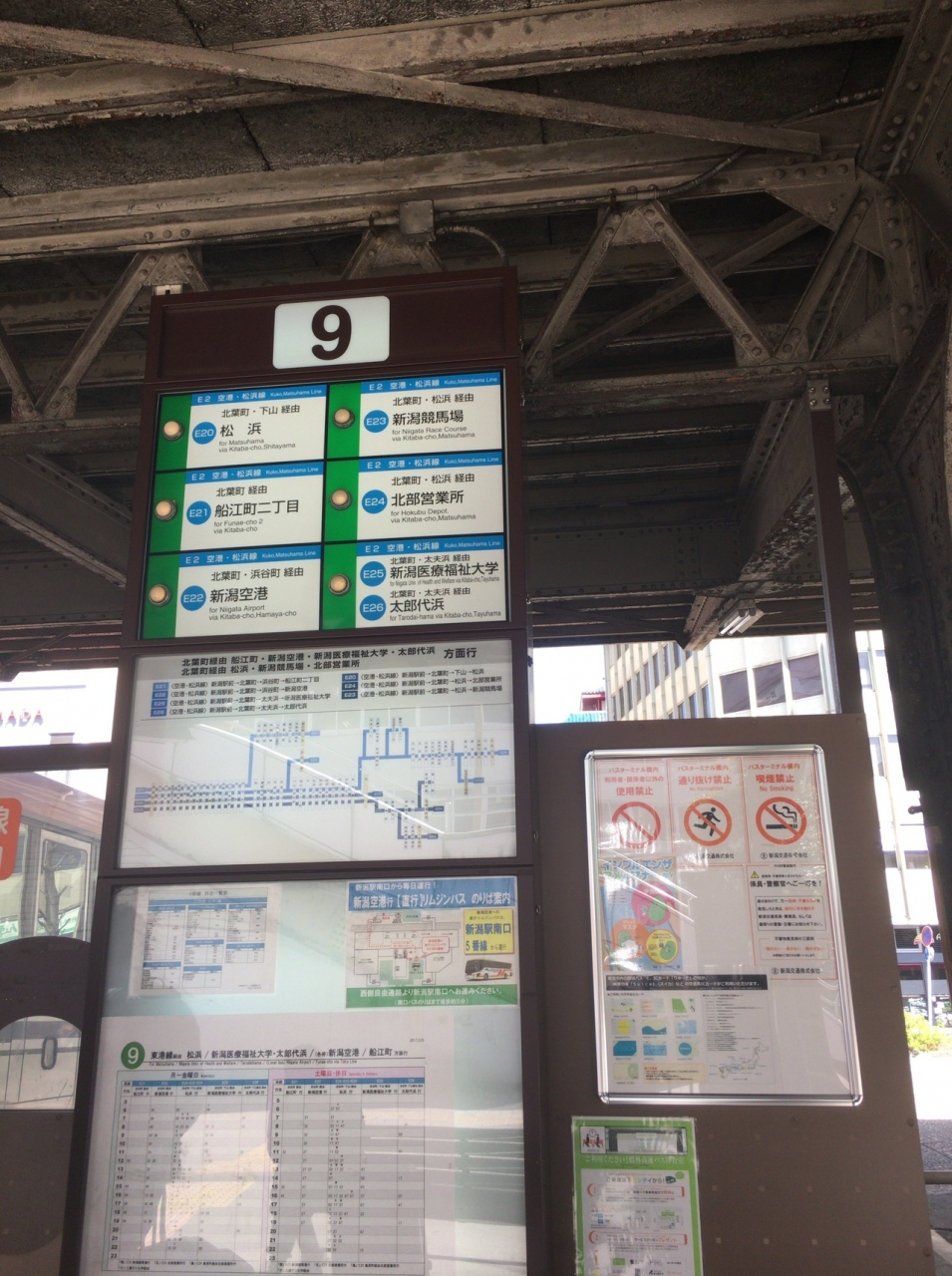 それほど混雑もなく、8割方は駅またはバスターミナルから空港という利用法だったと思います。時間が合えば、万代口側からならこちらの路線バスがおすすめです。新潟駅からの乗り場は画像の9番です。