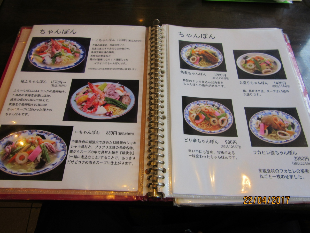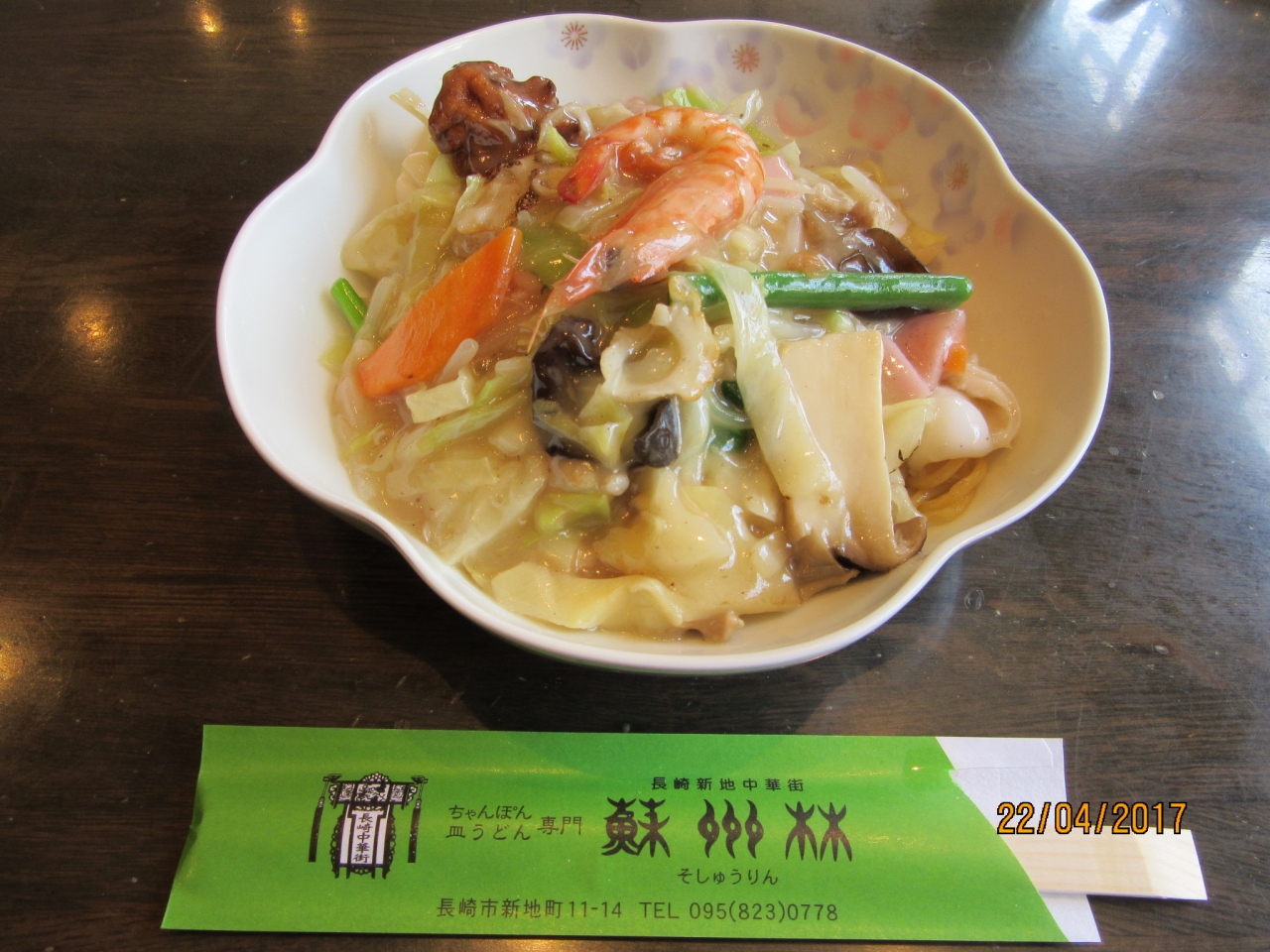 2人掛け1卓。昼食時間をずらして遅めの利用だったので待たずにすんなりと2階に案内された。一押しという【上皿うどん1,296円】を注文。太めんで五島の車エビ・長崎甲イカ・旬の野菜等17種類の具材が豪華に入ったもの。他のメニューは、上チャンポン1,296円、チャーハン756円、フカヒレスープチャーハン1,620円、一品料理・点心・甘味・コース料理も充実していた。