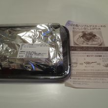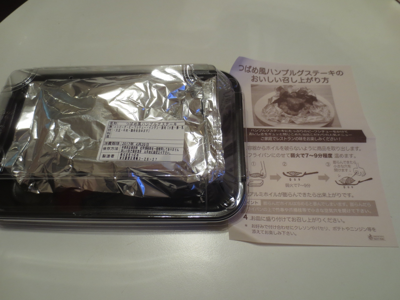 つばめグリルのハンブルグステーキをテイクアウトしました。夕食のメインとして。お店で食べるのも美味しいですが、テイクアウトでもきちんとアルミホイルに入っていて、「美味しい召し上がり方」と書かれた説明書ももらえるので、家でも手軽に美味しくいただくことが出来ます。このハンブルグステーキであることで、ちょっと豪華なディナーになりますね。