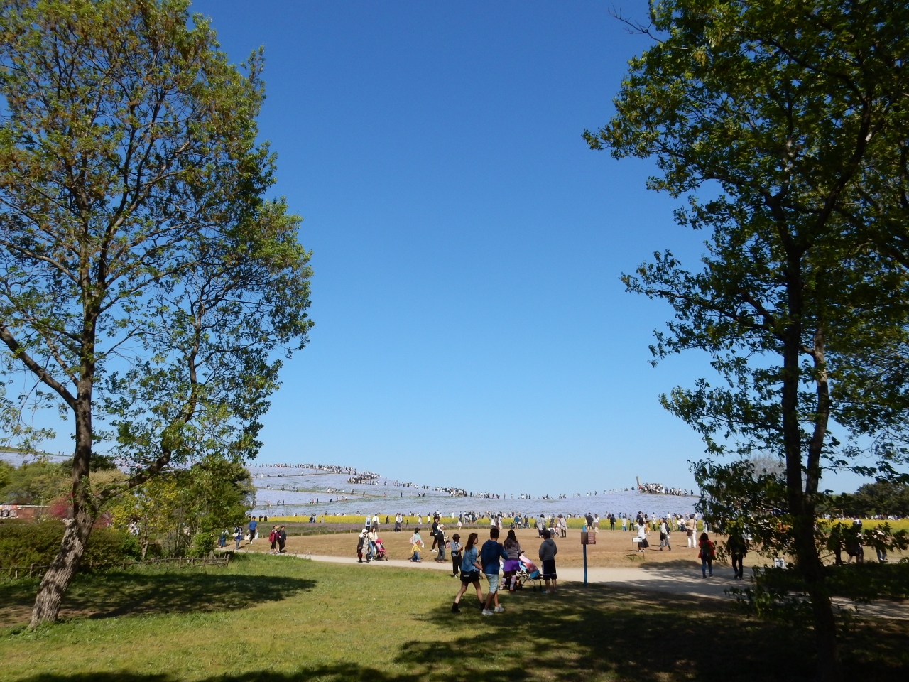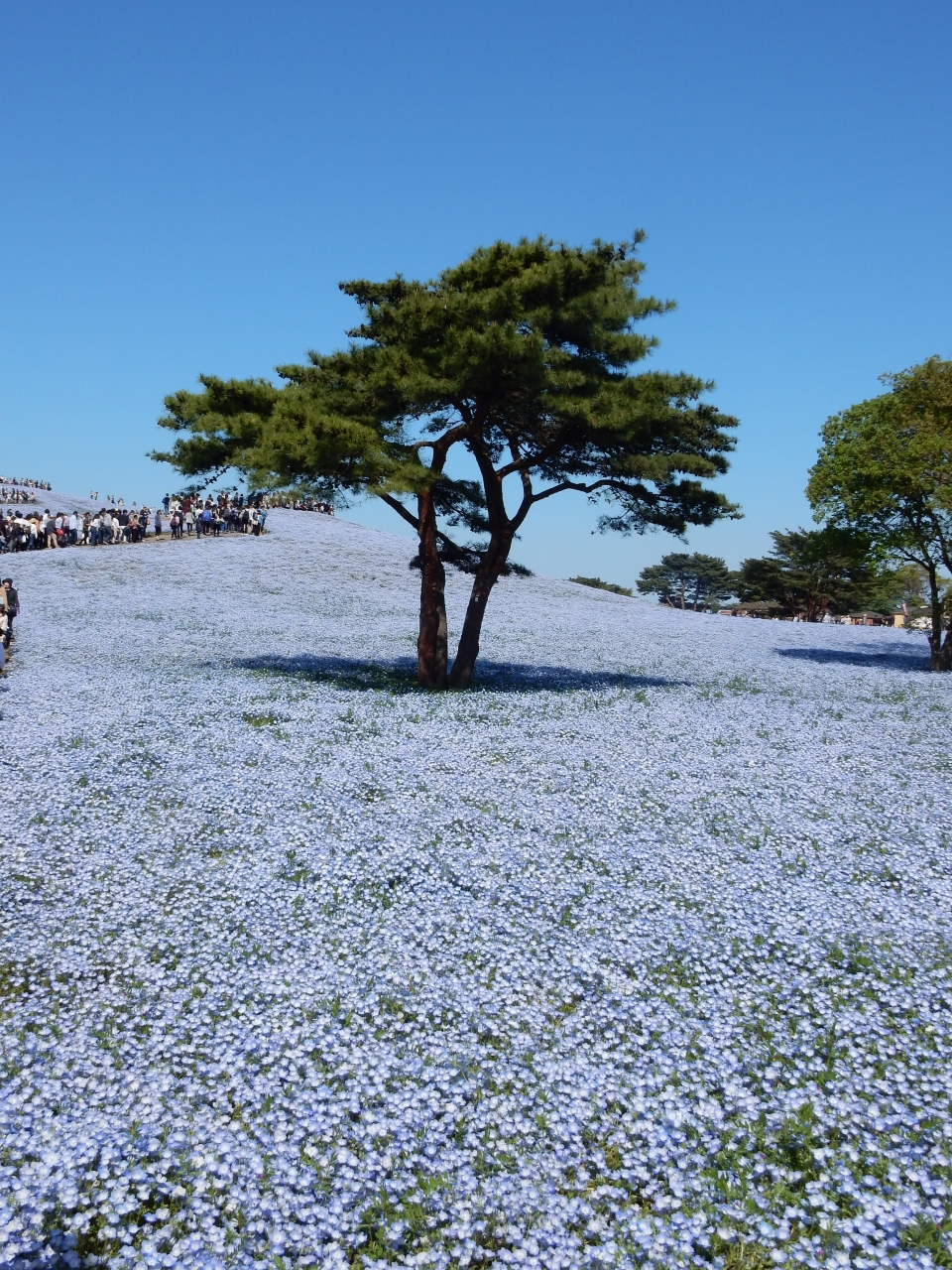 連休の谷間の午後2時頃は穴場かも知れません。連休中に訪れた知人は、開園時間の7時半前についていたのに、入場にかなり時間がかかったようですから、ネモフィラの時期は十分覚悟していく必要がありそうです。