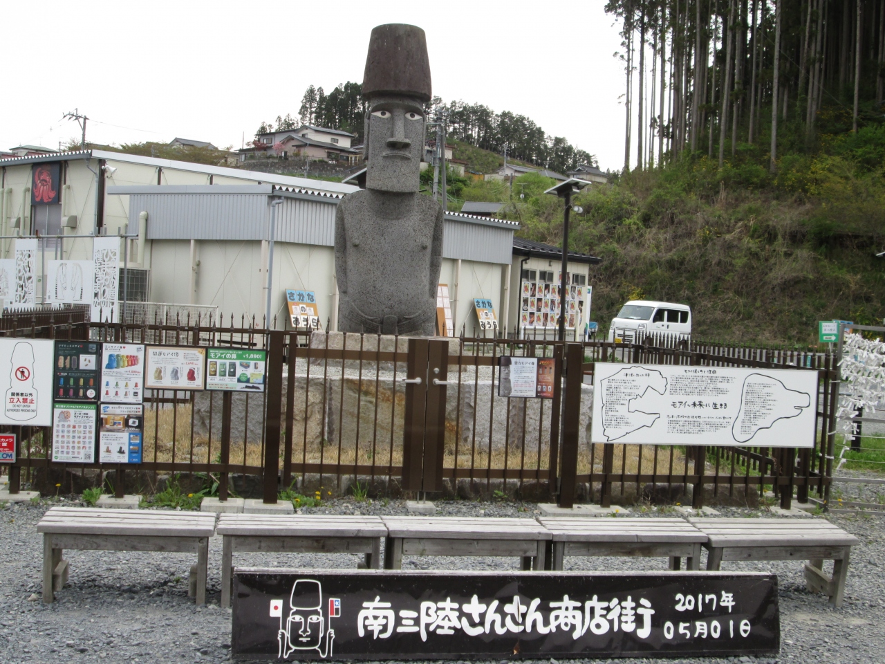 1991年に、南三陸町がふるさと創生事業で設置したモアイ像。それが、津波で流されて、新しいモアイ像が送られたとのこと。もともとのふるさと創生事業の設置のきっかけは、チリ地震津波であり、津波と関連するモアイ像です。また目に他の石が入っているモアイ像は世界でも少ないとか。