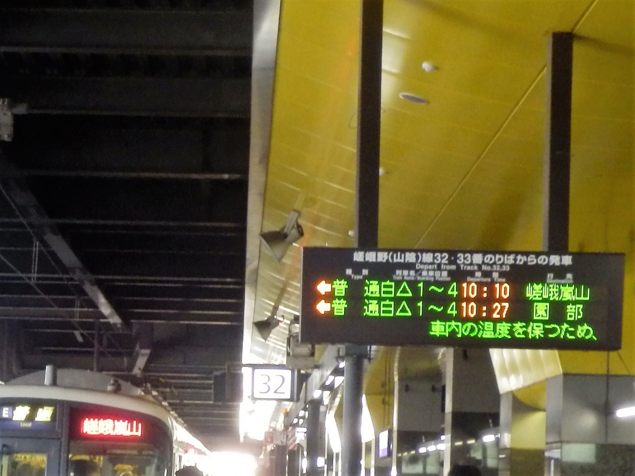 京都から嵐山へ向かう時出発地がJR京都駅に近かったこともありJR嵯峨野線を初めて利用した、嵯峨野線は山陰線の京都と園部間の路線の愛称、京都駅の乗場は0番線の西端にある突当りホームから出ています。昔から使い勝手の悪い線路と思っていたが運行本数も多数あり、速度も早くなって約20分弱で嵯峨嵐山駅に着きました。最近JRのきめ細い運行サービスが徹底してきたと感じました