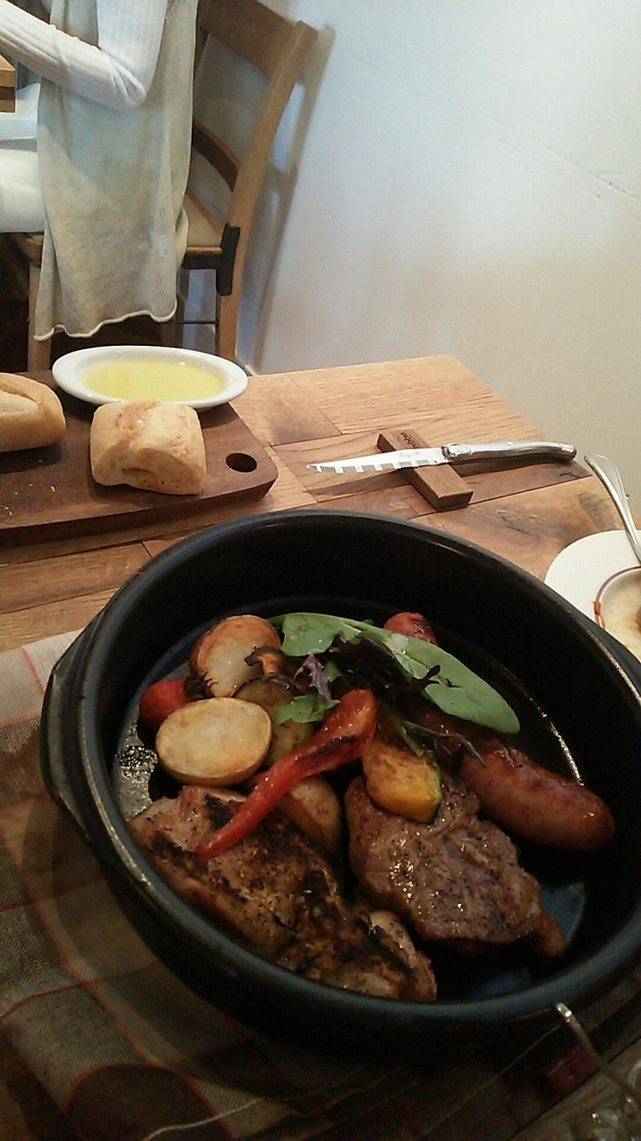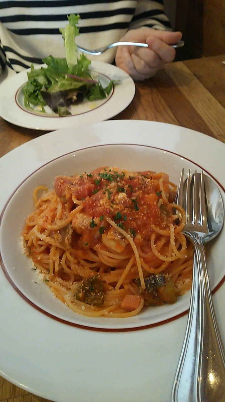 ランチは鶏肉のトマトソースパスタ(100gが通常サイズ、+20gは無料で増量)とお肉(サルシッチャ、豚、鶏)と野菜のグリルをオーダーし、友人とシェアしていただきました。