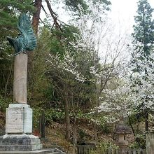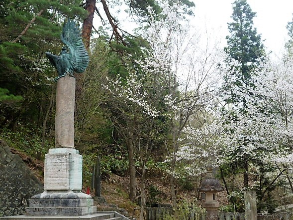 飯盛山スロープコンベアで`白虎隊のお墓`を参拝した時に、下車して階段を上がると途中から目に付くのは[ローマ市寄贈の碑]でした。お墓は奥にありその周りは別の碑もありました。異国の碑(ローマで鷲!)があるのは国際的なお悔やみを表しているのですネ。日本のお墓に広場 with 国の内外からの碑は日本では稀ですよネ? 4月なので桜が満開でした。
