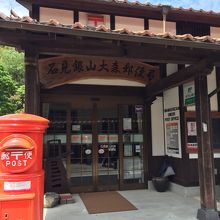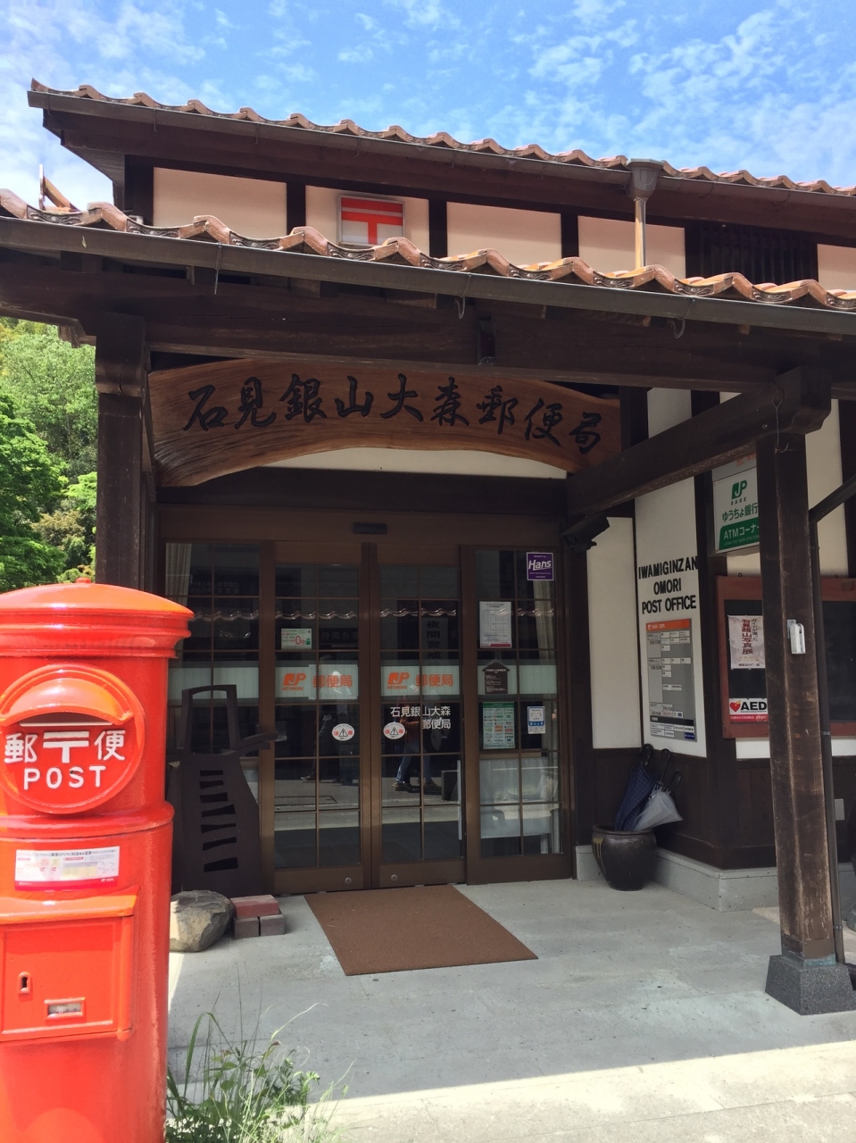 郵便局前のポストも、よくある赤い四角いものではなく、丸い昔のタイプでマッチしています。