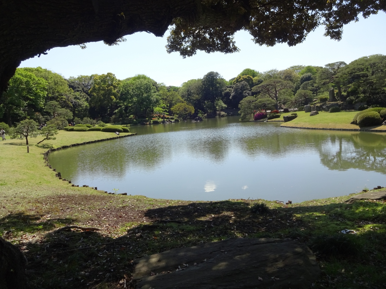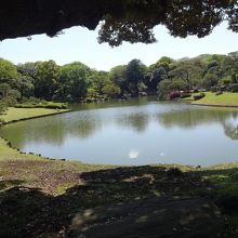 ツツジの植え込みと芝生と池がマッチしてきれい。