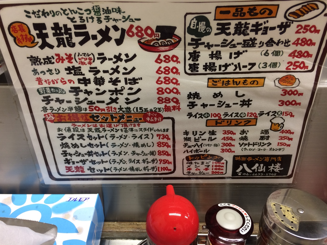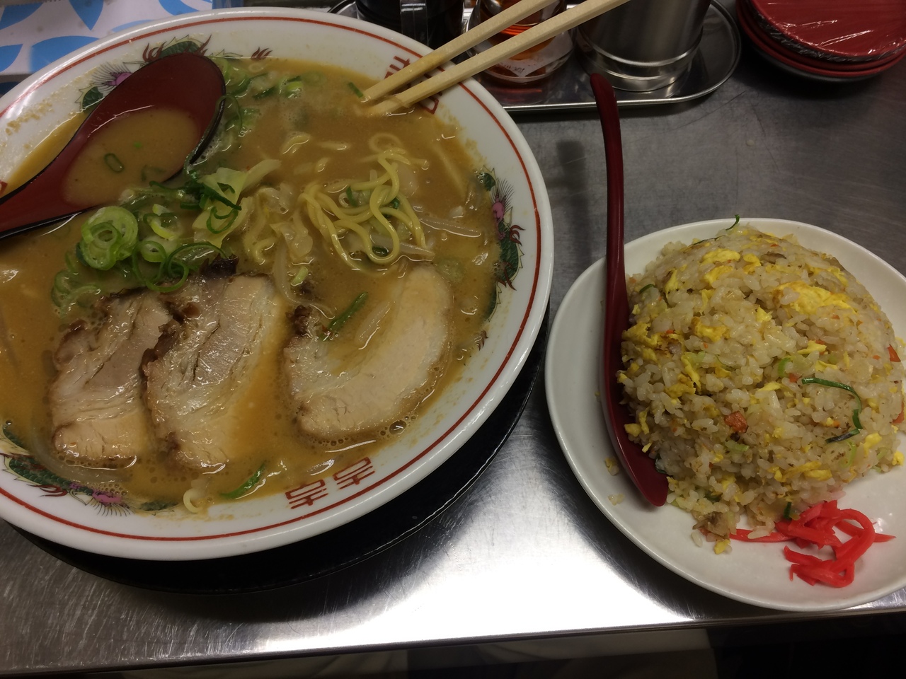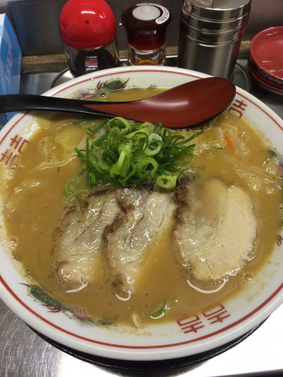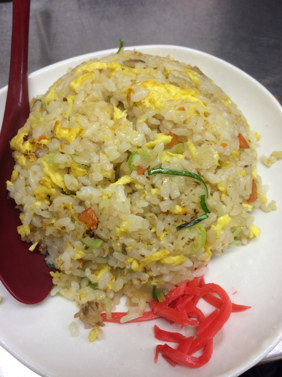 コの字型のカウンター席のみで15席ぐらいあります。夜は黄色い看板のネオンが目立ちつられて入店しました。ラーメン類とご飯物、餃子等のサイドメニューがあります。味噌ラーメンは細麺でネギがたくさんのっていてチャーシューは3枚付いていました。スープがマイルドな味でした。焼飯は鉄板で何十回も混ぜる音がし、卵味が効いた味でした。