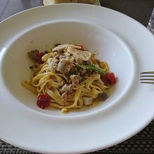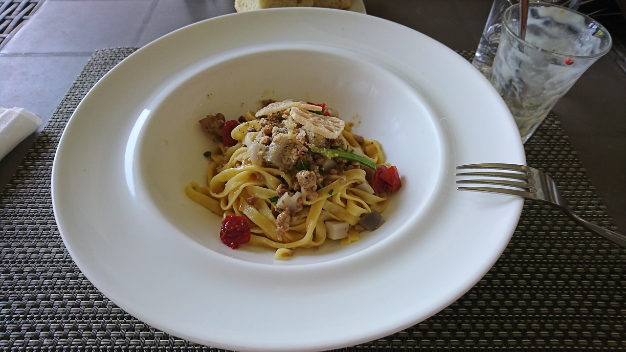 サラダ、パスタ、ミニデザート、ドリンクがついて1980円のランチセットを食べました。