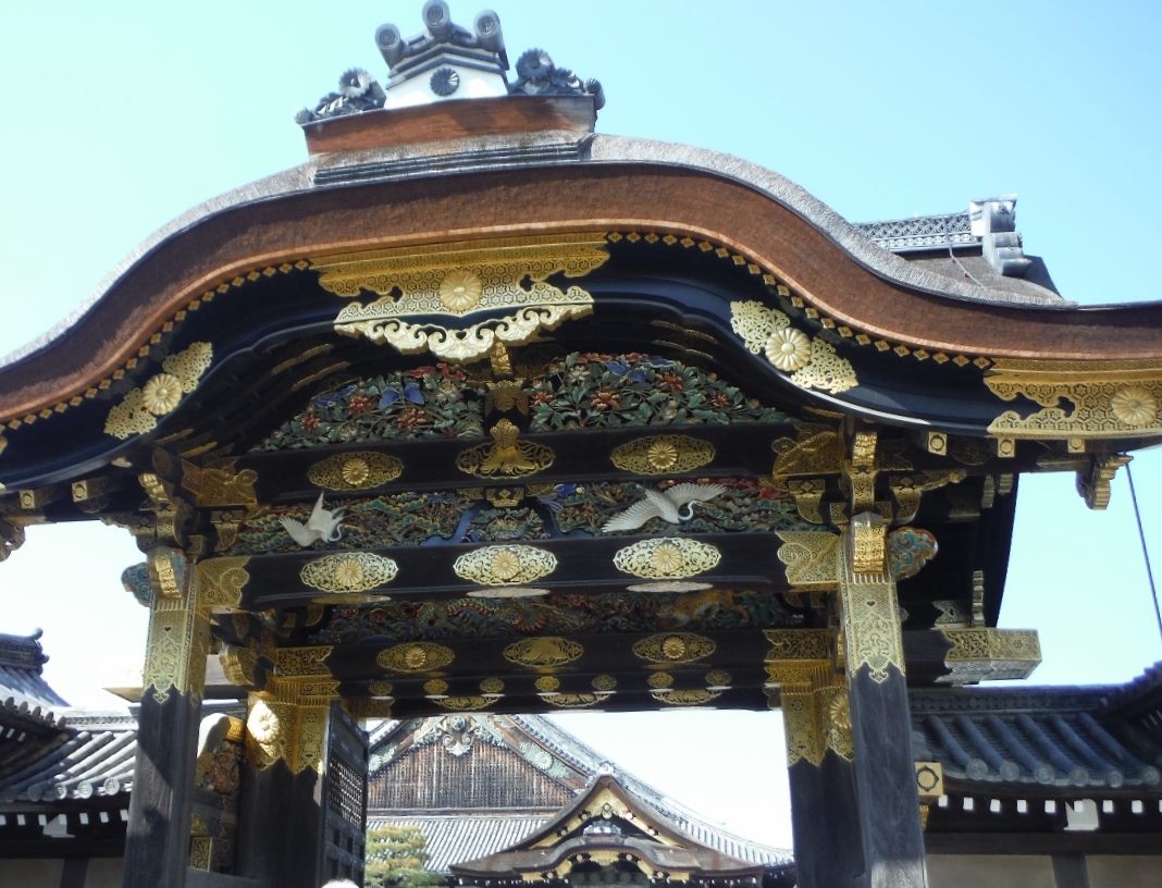 二の丸御殿の正門にあたる唐門。重要文化財です。2013年に修復工事があったそうです。遠くから見ても絢爛豪華なのですが近くでみると層になっているのがよくわかり、それぞれに装飾が見事です。鶴や虎、蝶、花などが色彩豊かに装飾されています。