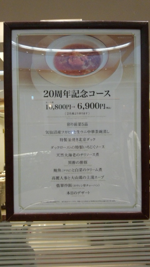 新宿の高島屋タイムズスクエア14階にある北京料理レストラン、連休中5月5日の17時半過ぎに妻と次男と3人でここに入りました。予約のお客さんが多く窓側席には座れませんでしたが、あと15分遅く来たら空席はなかったのでよかったです。通常10,800円の『20周年記念コース』が6,900円の特別価格だったので、これを迷わず注文しました。
