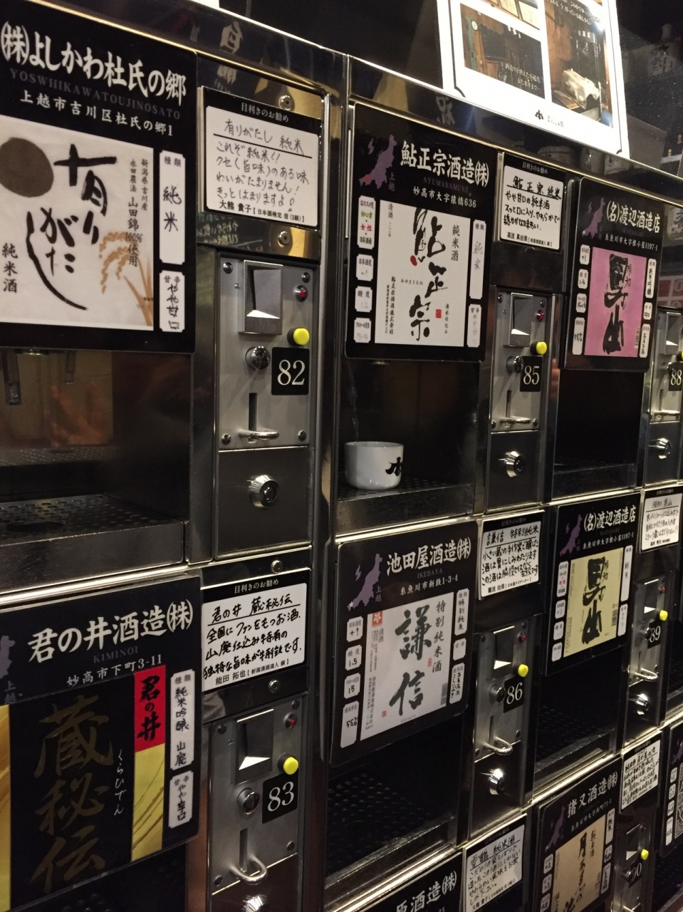 500円で5杯分のコインを購入。壁ににずらっと並んだ日本酒から好きなものを選びます。