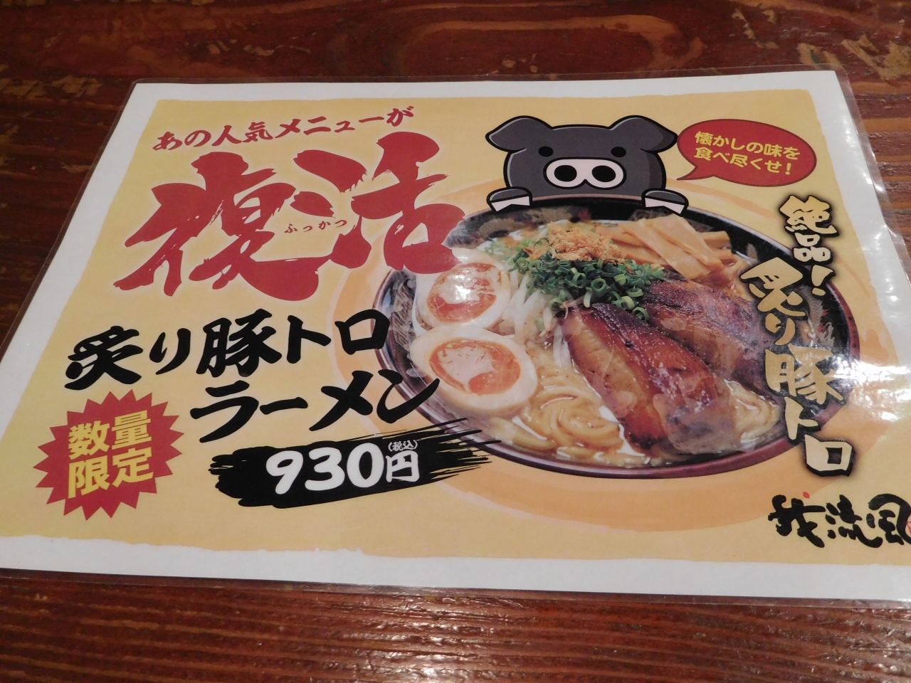 イオン鹿児島鴨池店のレストラン街にある、鹿児島ラーメンのお店です。せっかく鹿児島に来たので、何かご当地ものが食べたいなぁとお店を探していた所、このお店が目に入り、数量限定の「絶品!炙り豚トロラーメン」を注文しました。こってりしたとんこつラーメンに、トロトロの炙り豚が乗っていて、なかなか美味しかったです。