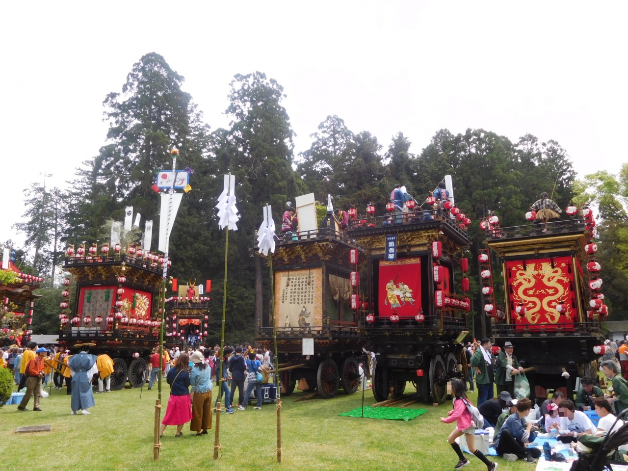 5月3日、日野祭り見学のために、訪問。日野町の東にそびえる綿向山(標高1,110m)の山頂に祀られている大嵩神社の里宮。日野商人の財力を感じさせる素晴らしい16基の曳山が狭い境内に勢揃いしていた。