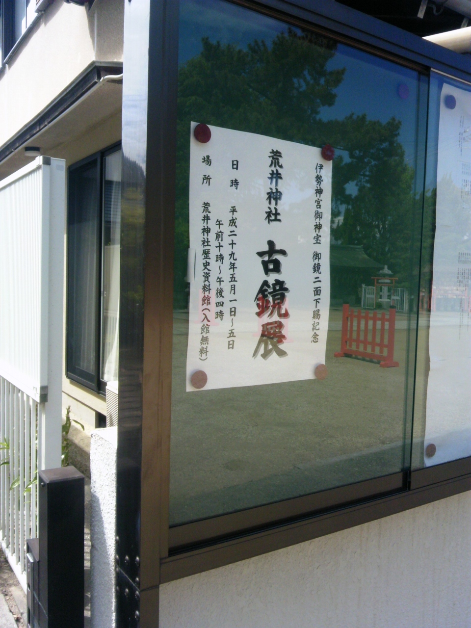 古鏡展というのをしていたので荒井神社へ行ってきました。中国の古代の鏡の解説と展示。それに伊勢神宮から貰った鏡の展示がしてありました。